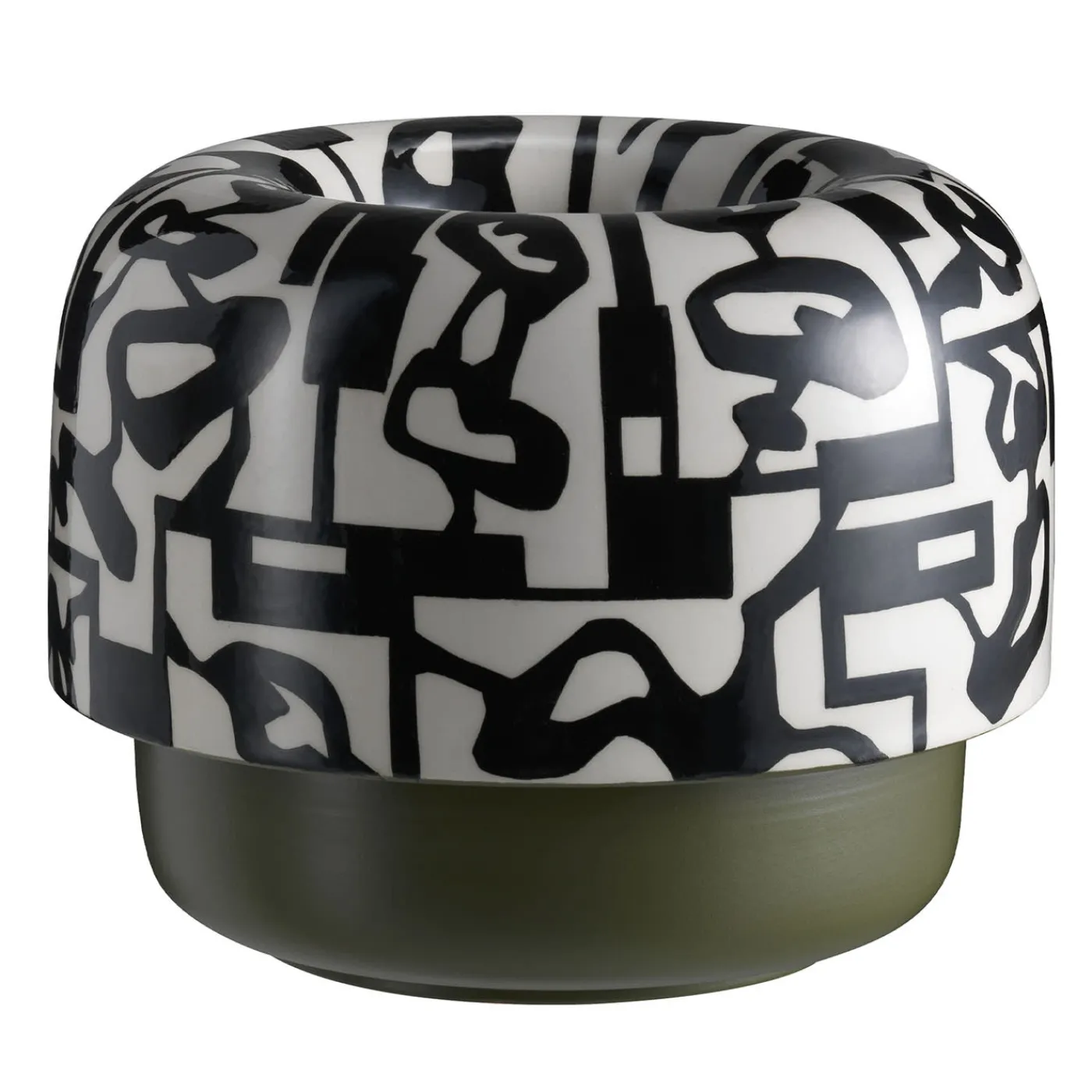 Dédale è un gioco di attrazione e intrappolamento: l’essenza di un labirinto mitico che invita a entrare. Parte di una serie di 3, Dédale invita a perdersi nella bellezza, con un labirinto di forme sia rigide che fluide. Questo vaso in argilla fatto a mano presenta uno smalto verde opaco sulla base, decorazioni nere dipinte a mano e una finitura cristallina sulla parte superiore. Disegnato da Jean-Christophe Clair.