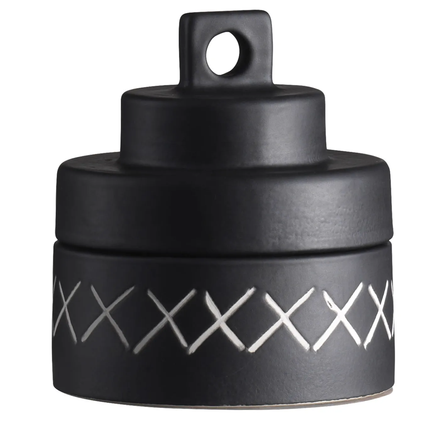 Oggetti conici e sferoidali giocano con linee e croci in un rituale in bianco e nero. Recipiente e coperchio in argilla, lavorati a mano, con finitura ingobbiata bianca e decorata in nero con uno smalto trasparente. Progettato da Ugo La Pietra