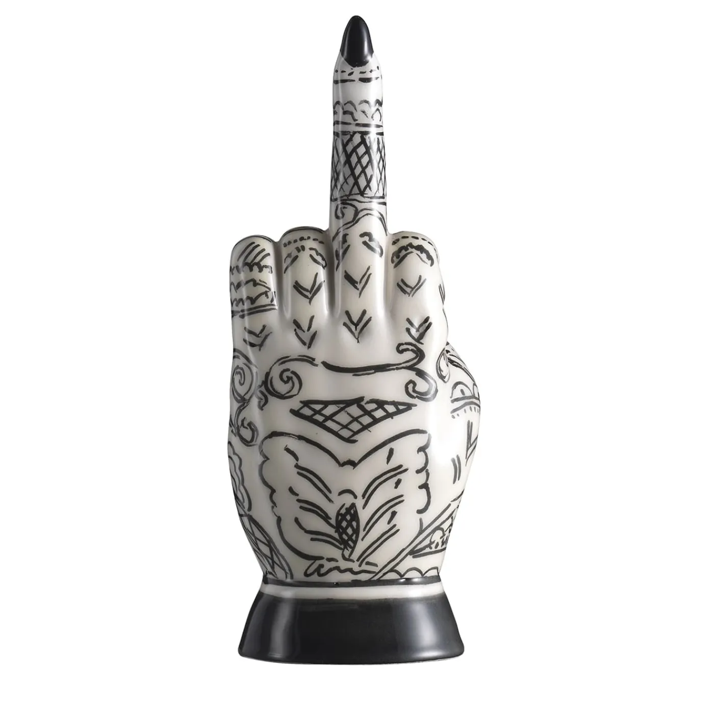 Una danza a ritmo tribale, seguendo geometrie e architetture magiche in cui si fondono energie e anime. Mano in argilla bianca fusa a mano, con decorazione nera dipinta a mano e finitura in smalto trasparente. Disegnato da Ugo La Pietra