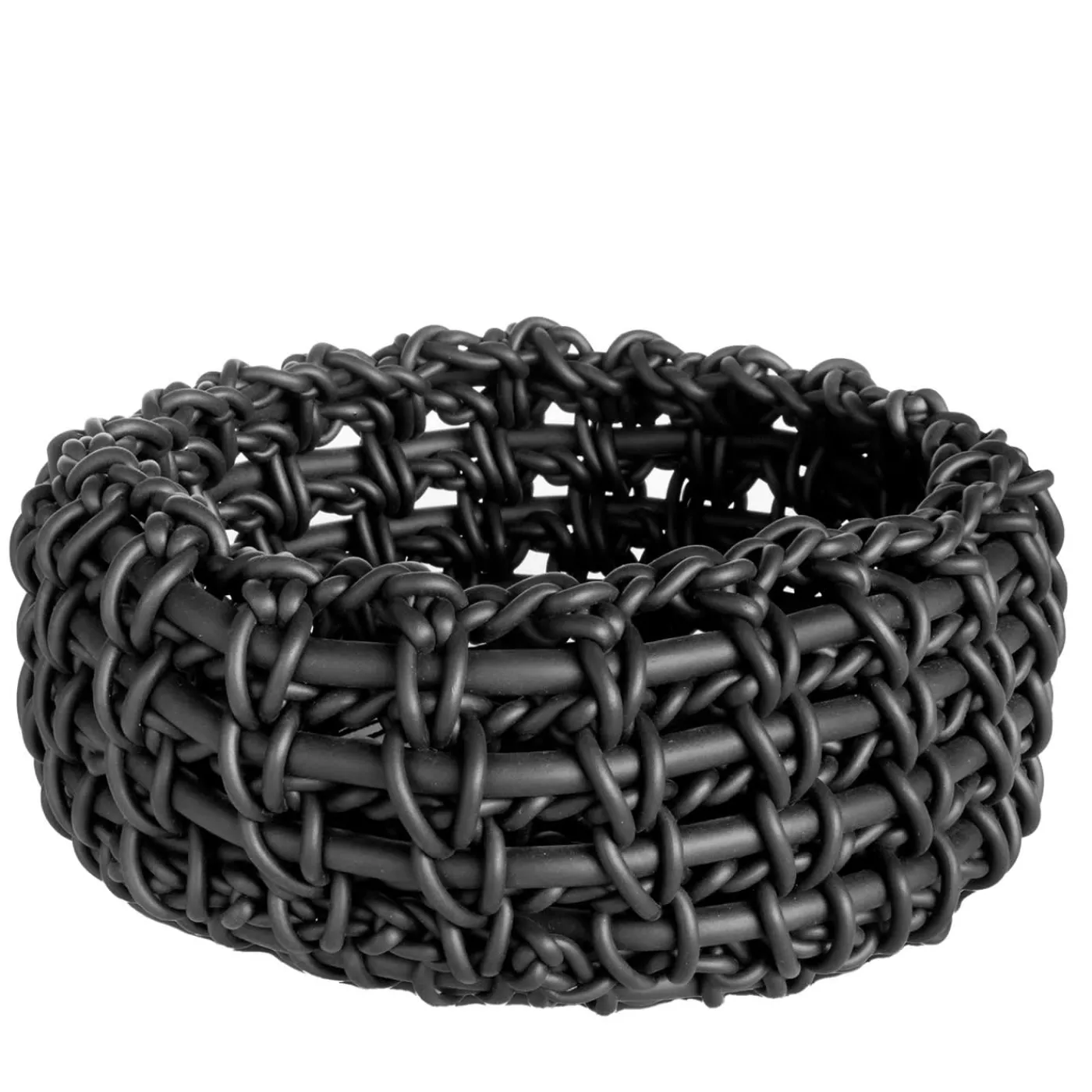 Questo squisito cesto è una splendida dimostrazione di meticolosa maestria artigianale. Completa gli ambienti interni ed esterni in stile contemporaneo ed è annodato a mano con filato di neoprene nero di 4 mm e 8 mm di spessore. Disponibile in altri colori, consultare il catalogo Artemest per le opzioni.