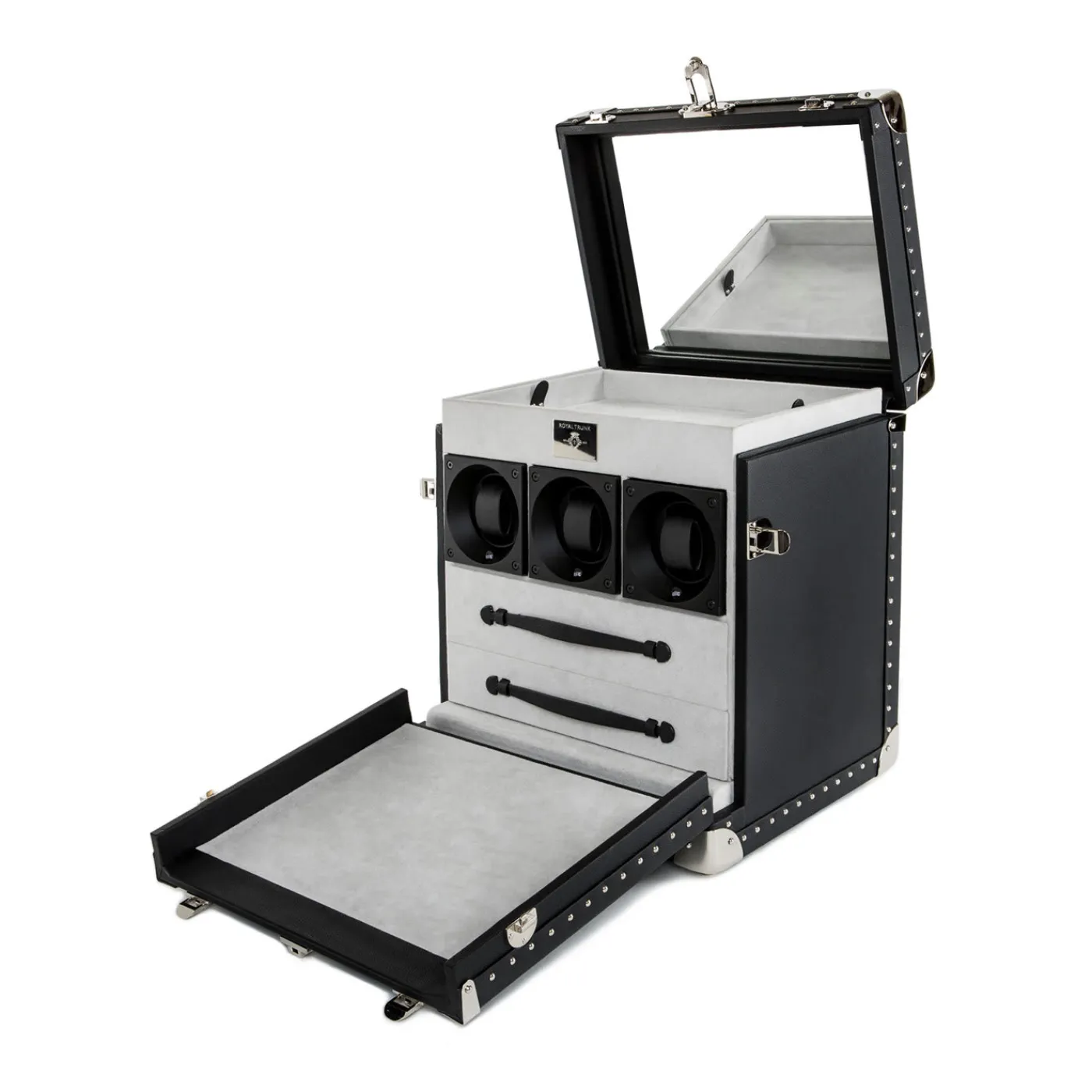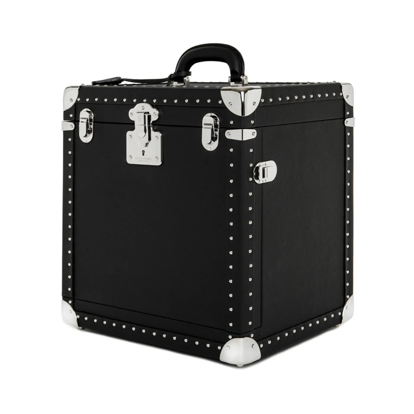 Questo raffinato beauty case creato sia per uomo che per donna presenta un esterno in pelle con maniglie in ottone e decorato con chiodi fatti a mano lungo tutto il suo perimetro. L’interno è rivestito in microfibra con uno specchio fisso nella parte superiore e un vassoio estraibile, due cassetti completamente attrezzati per riporre gioielli e orologi e tre rotori per orologi Swiss Kubic, specificamente progettati per gli orologi automatici e di fabbricazione svizzera; questi rotori sono un caricatore all’avanguardia e funzionano con batterie normali.
