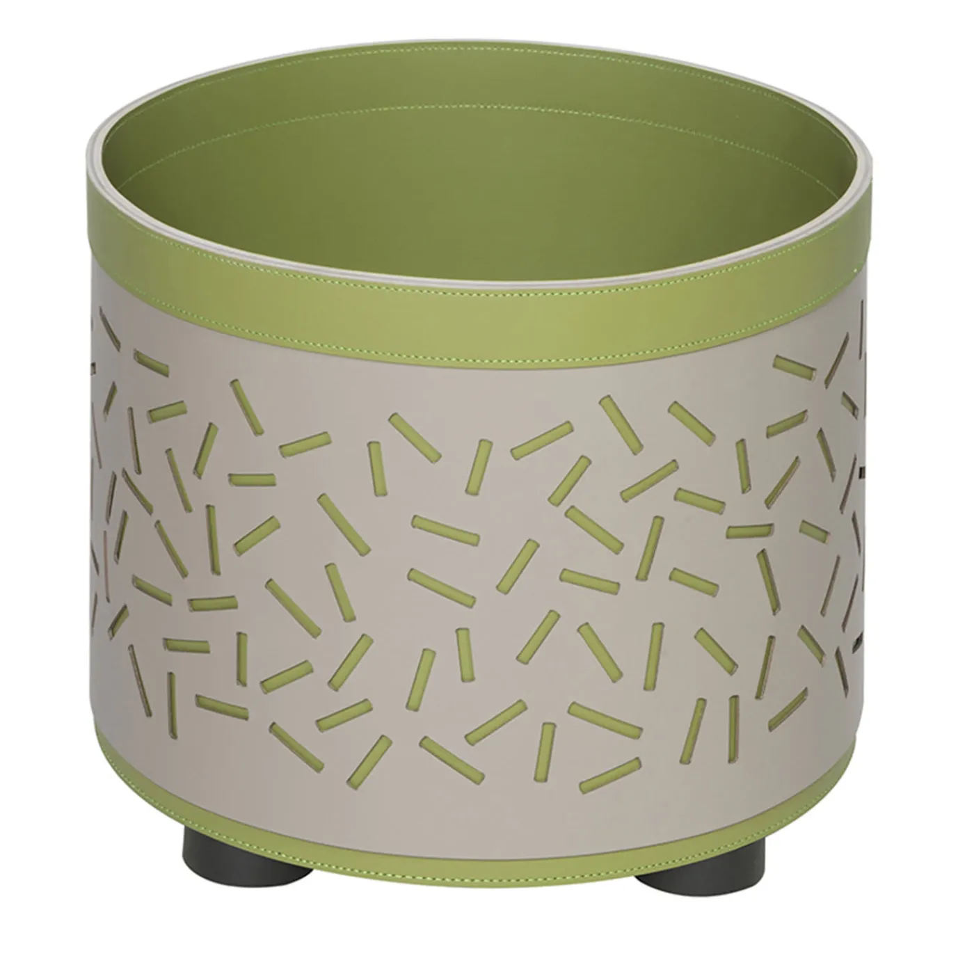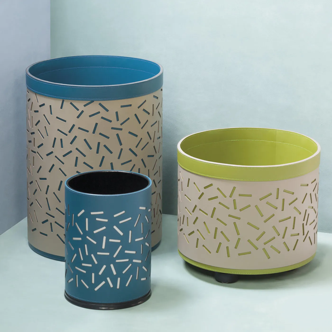 Questo cestino rotondo presenta un design semplice ma interessante fatto di piccoli ritagli, tutti disposti liberamente. Il cestino è interamente realizzato in finissima pelle rigenerata con finitura resistente all’acqua e ai raggi UV. Ideale per il bucato, gli asciugamani, le piante o gli oggetti di uso quotidiano, è dotato di ruote per un facile spostamento. Ideale per uso interno ed esterno. Disponibile in versione bicolore e monocromatica.