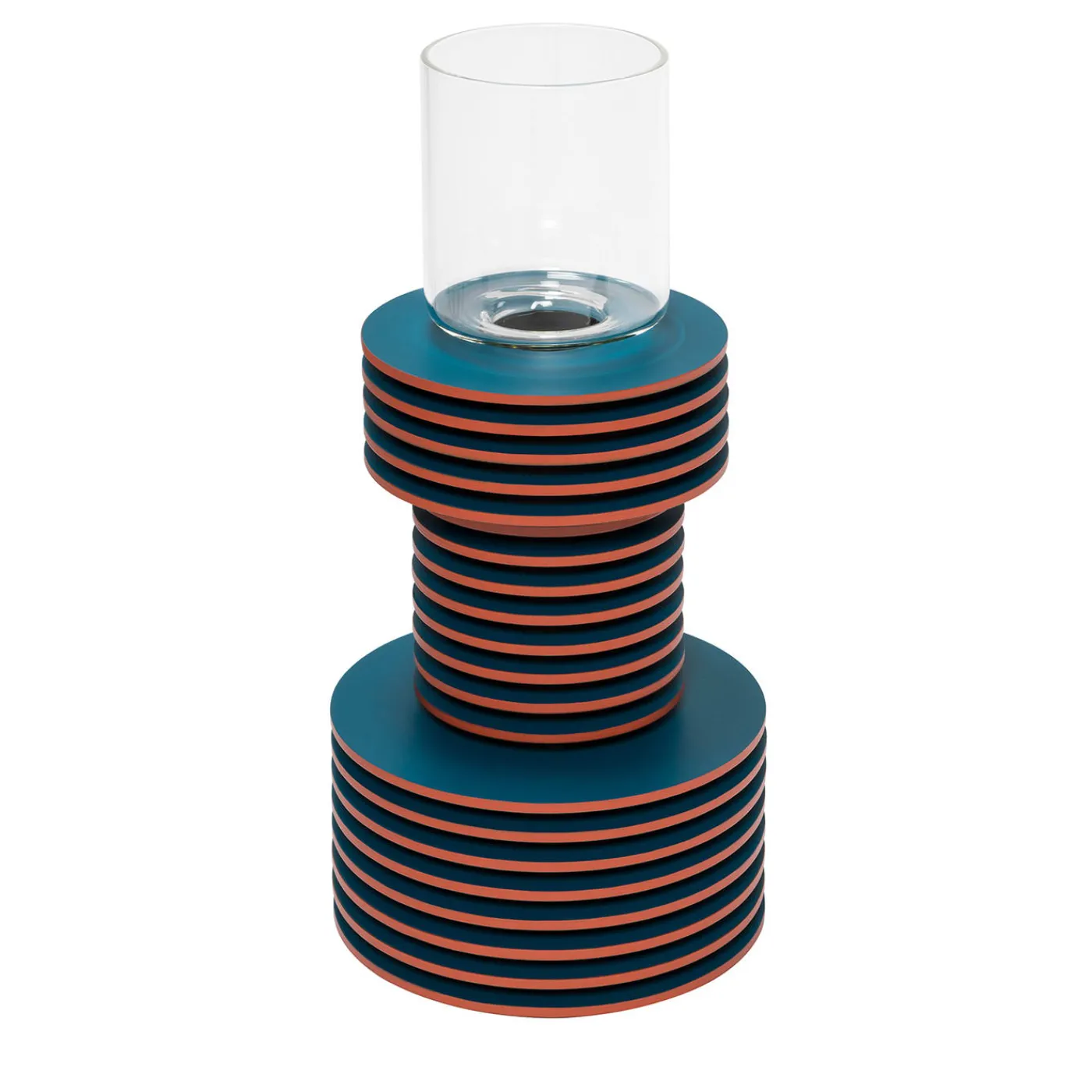 Struttura in vetro borosilicato trasparente parzialmente ricoperta da dischi di Tecnocuoio sovrapposti. Finissima pelle rigenerata con finitura impermeabile e resistente ai raggi UV. Per ulteriori informazioni, contattare il Concierge.