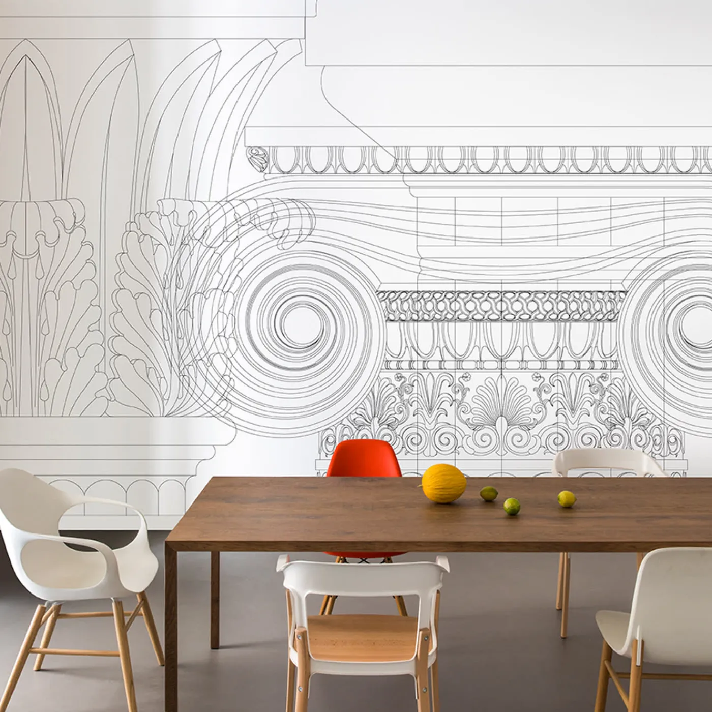 La collezione di carte da parati Layers elabora diverse giustapposizioni temporali e geometriche immaginando un passato digitale. Elementi classici come colonne e capitelli, in un trionfo di forme wireframe. Design di Chiara Pellicano e Edoardo Giammarioli. Prezzo al metro quadro.