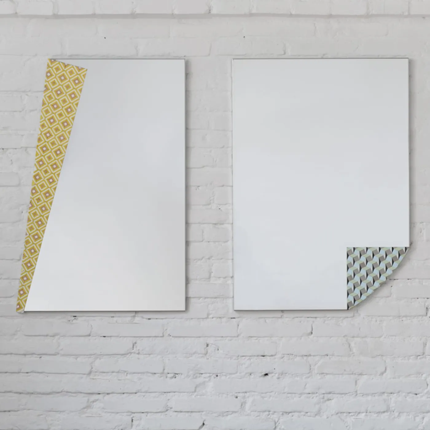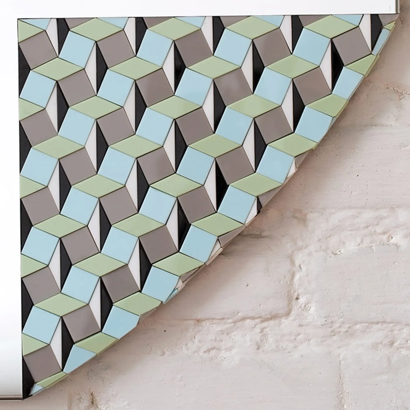 Gli specchi Risvolti mescolano in modo non convenzionale un materiale high-tech come l’acciaio Supermirror e il vetro opalino uscito di produzione dagli anni ’50. La modernità dell’acciaio contrasta il gusto vintage delle nappe colorate del mosaico, sapientemente posizionate per disegnare due motivi diversi.