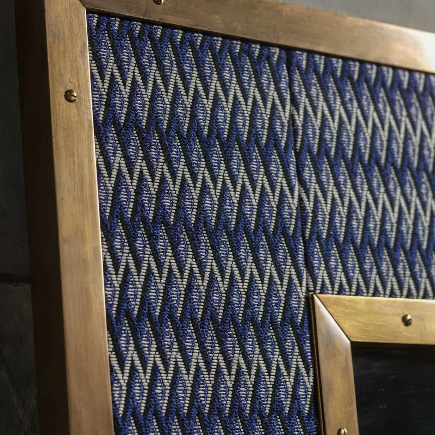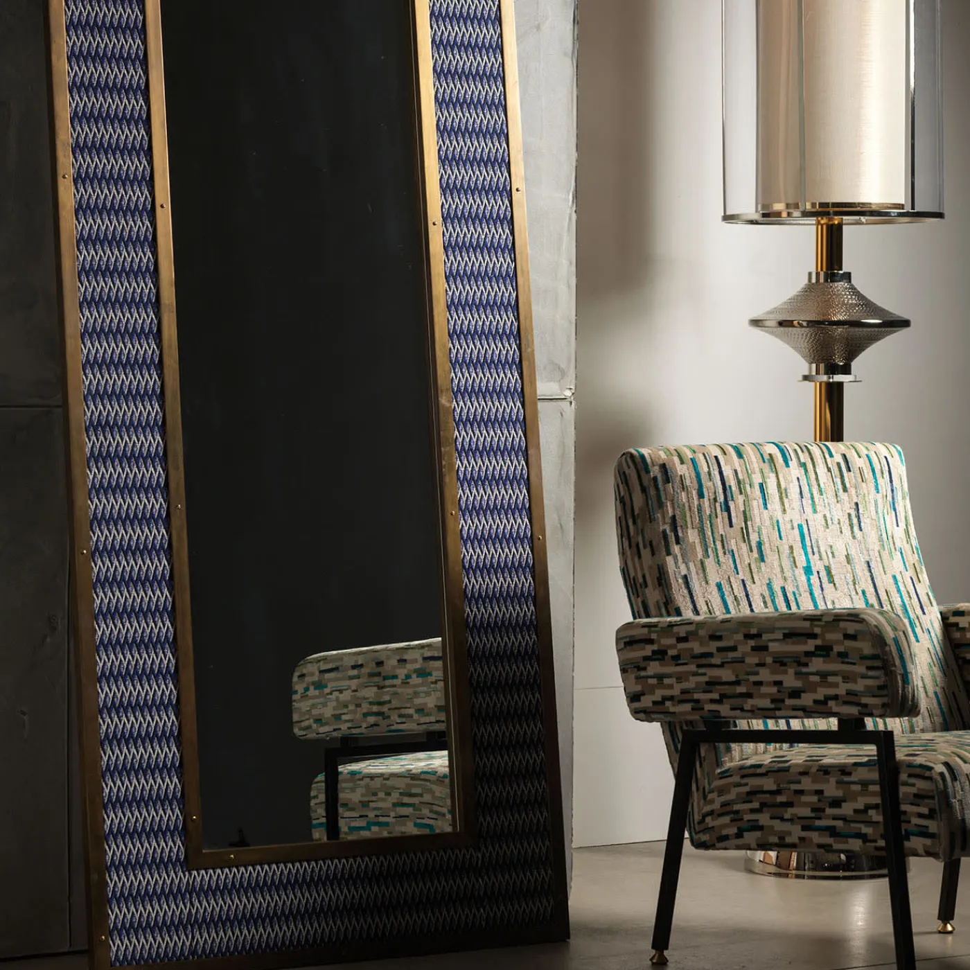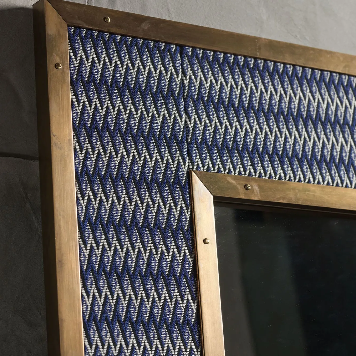 Questo splendido specchio rettangolare è un esercizio di eleganza nelle finiture e di valore sartoriale. Delineata da luminosi profili in ottone con finitura naturale, la cornice sfoggia un raffinato rivestimento in tessuto che ipnotizza con il suo ampio motivo a zig-zag che emerge da un rassicurante sfondo blu. Questo pezzo sarà un’aggiunta superba agli arredi di ispirazione vintage e a quelli moderni.
