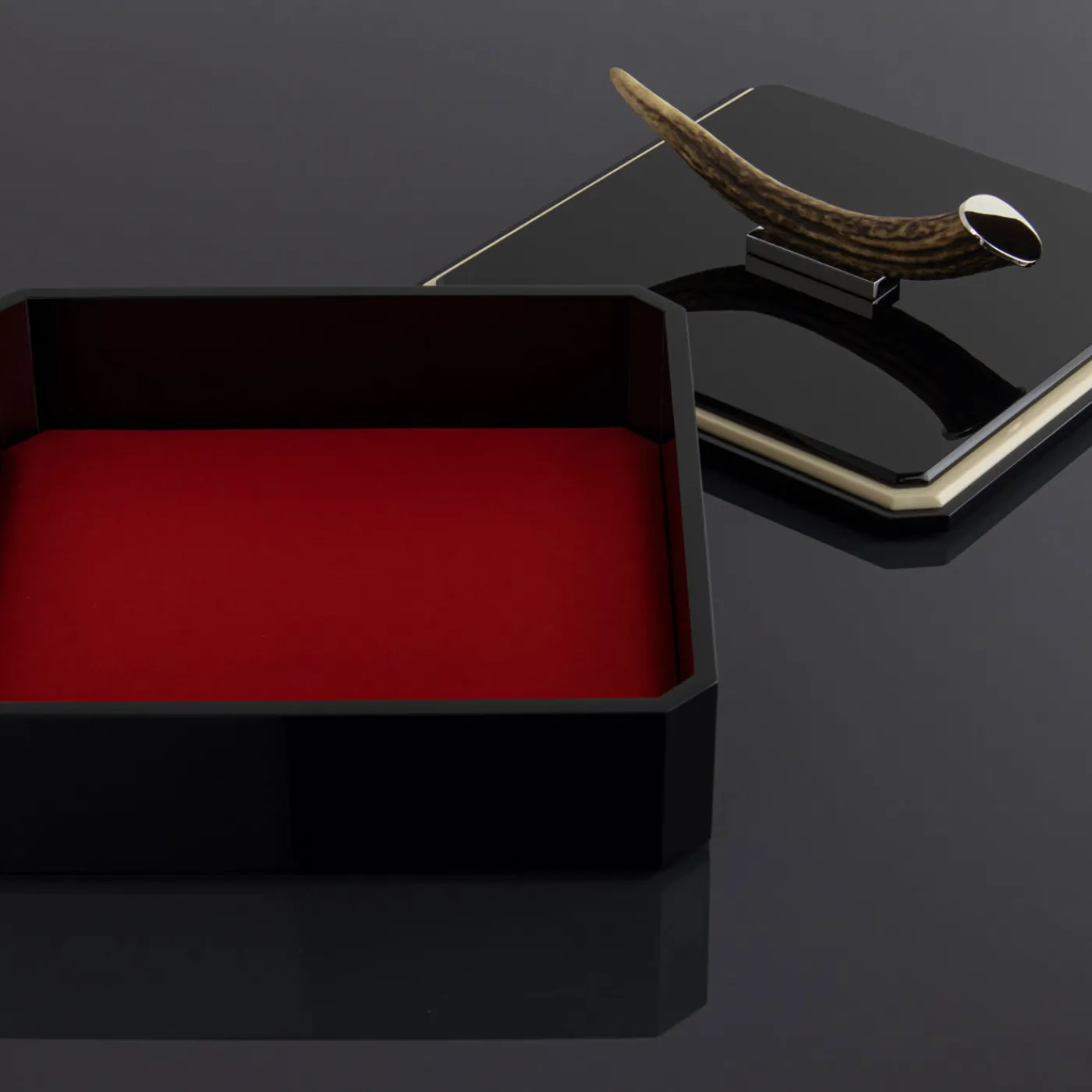 Pur ispirandosi a Diana, dea della caccia, per questa collezione sono stati utilizzati solo corni di capanno. La lucite nera profonda abbinata a una lucite avorio sottolinea questo tema, mentre i corni sono montati con montature in ottone rifinite in nichel.