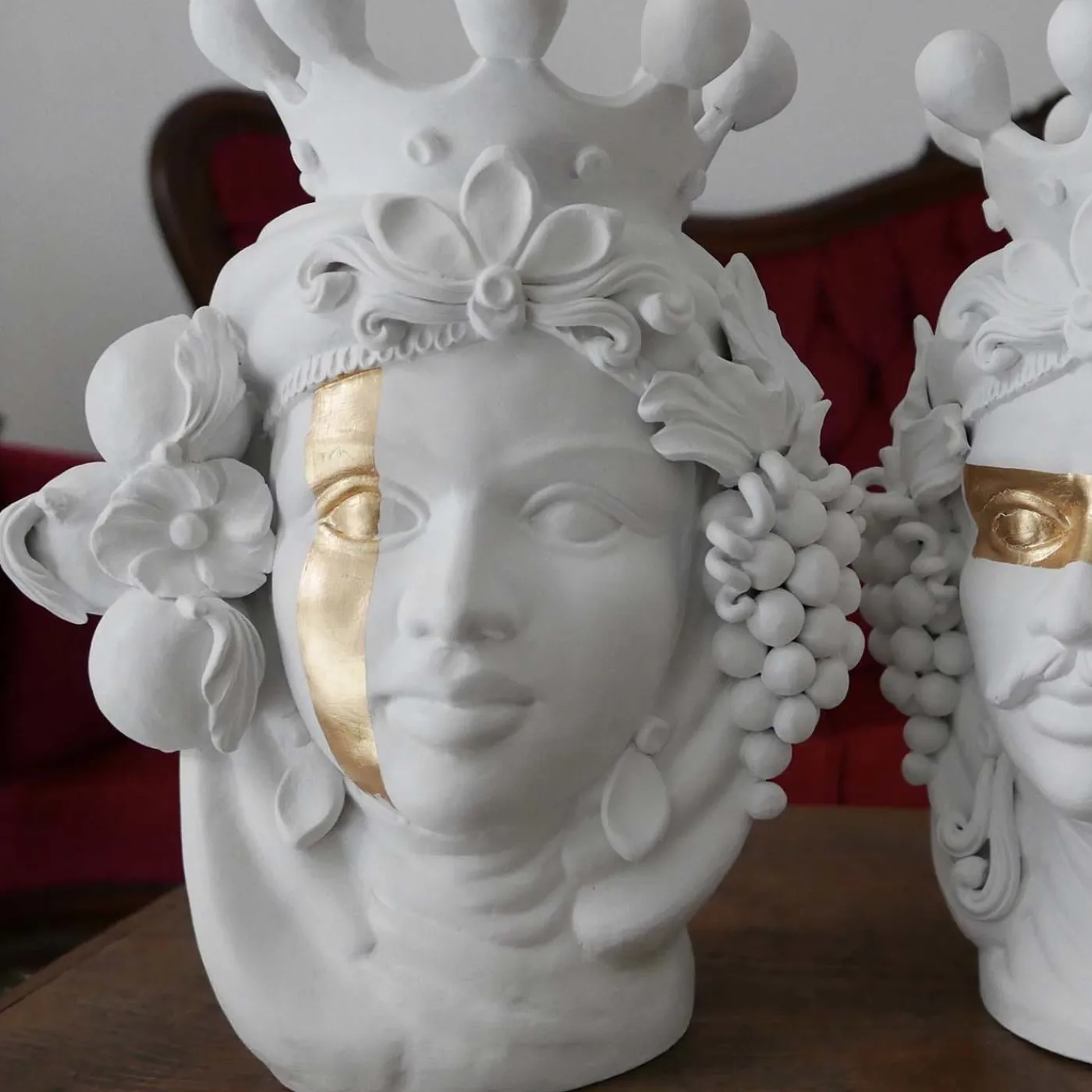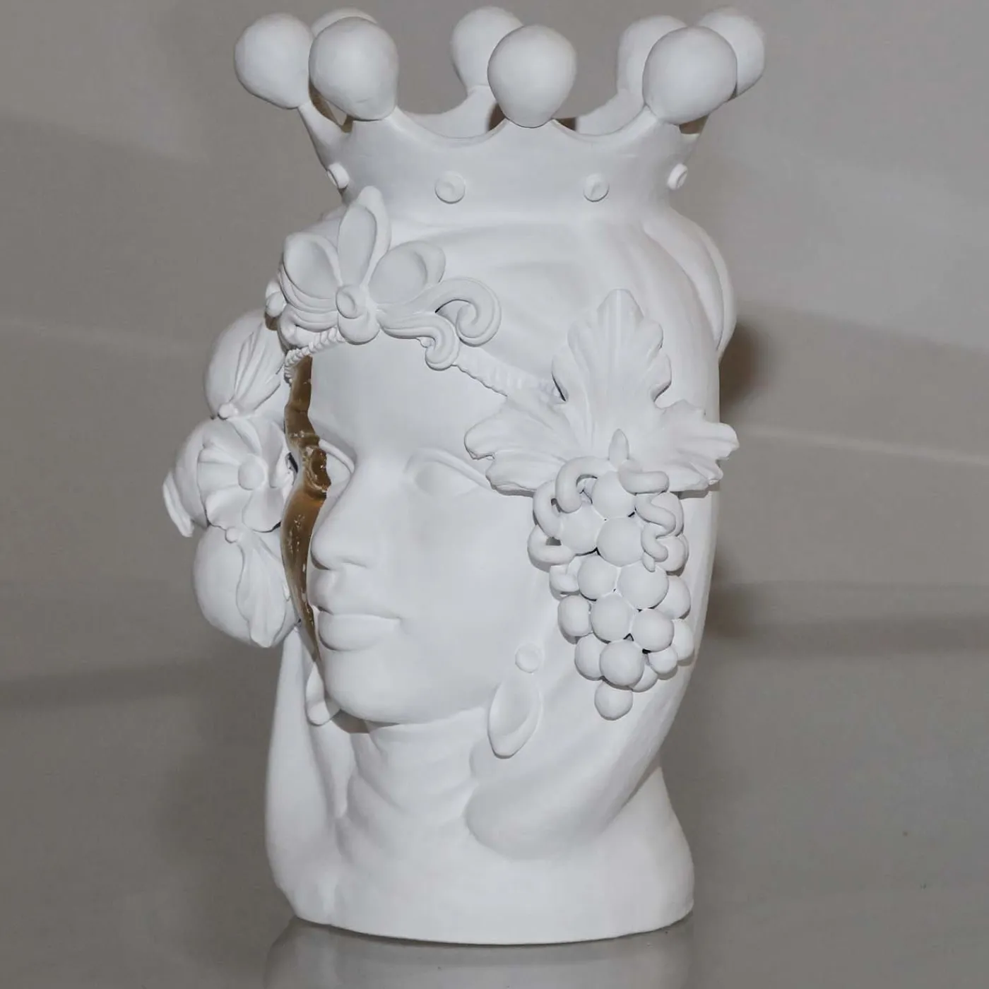 Questo vaso a forma di testa, realizzato a mano, si distingue per l’uso sapiente di dettagli scultorei e colori semplici, che aggiungono un tocco drammatico all’arredamento di cucina, soggiorno o ingresso. Questa scultura di donna vanta un’impeccabile carnagione bianca incorniciata da un morbido grappolo d’uva, ciocche di capelli fiorite e una corona regale. Il soggetto, tratto da una leggenda siciliana risalente alla conquista musulmana, è rivisitato con un tocco moderno e realizzato in terracotta con uno smalto bianco opaco, accentuato dall’audace striscia in foglia d’oro che corre verticalmente lungo il viso, enfatizzando la bellezza dello sguardo. Il vaso non può essere riempito d’acqua.