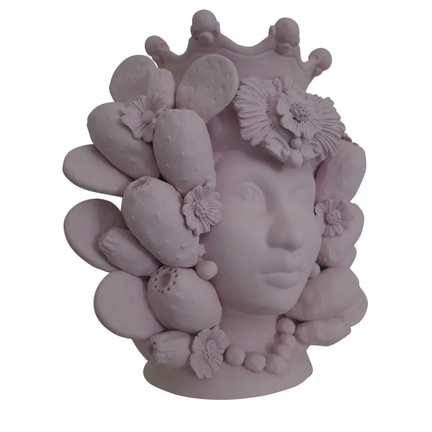 Questo vaso antropomorfo è realizzato interamente a mano e dipinto in una tinta monocromatica rosa chiaro opaco, ricca di pigmenti naturali e leganti resinosi che conferiscono un’intensa profondità cromatica. Solo gli occhi sono smaltati per farli risaltare, enfatizzando la bellezza dello sguardo. Il pezzo si ispira alle antiche leggende siciliane di amore e vendetta tra un moro e una fanciulla. Il vaso non può essere riempito d’acqua.