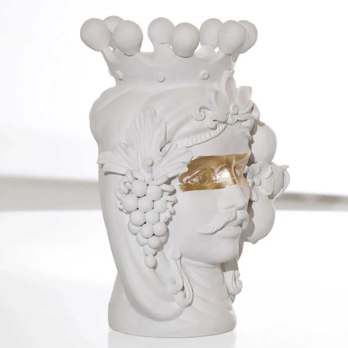 Maestoso e audace, questo affascinante vaso antropomorfo raffigurante un uomo è una testimonianza del ricco patrimonio artistico e storico della Sicilia. Realizzata in terracotta con uno smalto bianco opaco, la scultura di un moro vanta dettagli meticolosi “en relief” che rivelano le ciocche di capelli color vinaccia e floreali, i vistosi baffi e il morbido turbante sormontato da una corona regale. Lo sguardo espressivo è ottenuto applicando una striscia di foglia d’oro sugli occhi, sottolineando il loro vibrante simbolismo di finestre dell’anima. Il vaso non può essere riempito d’acqua.