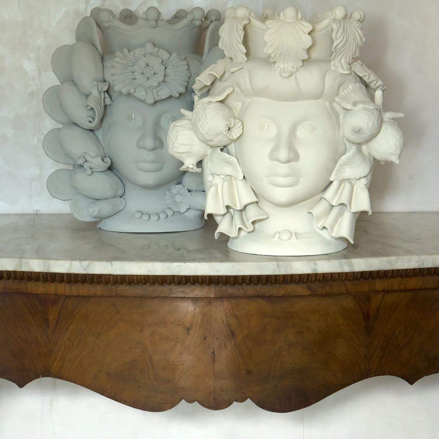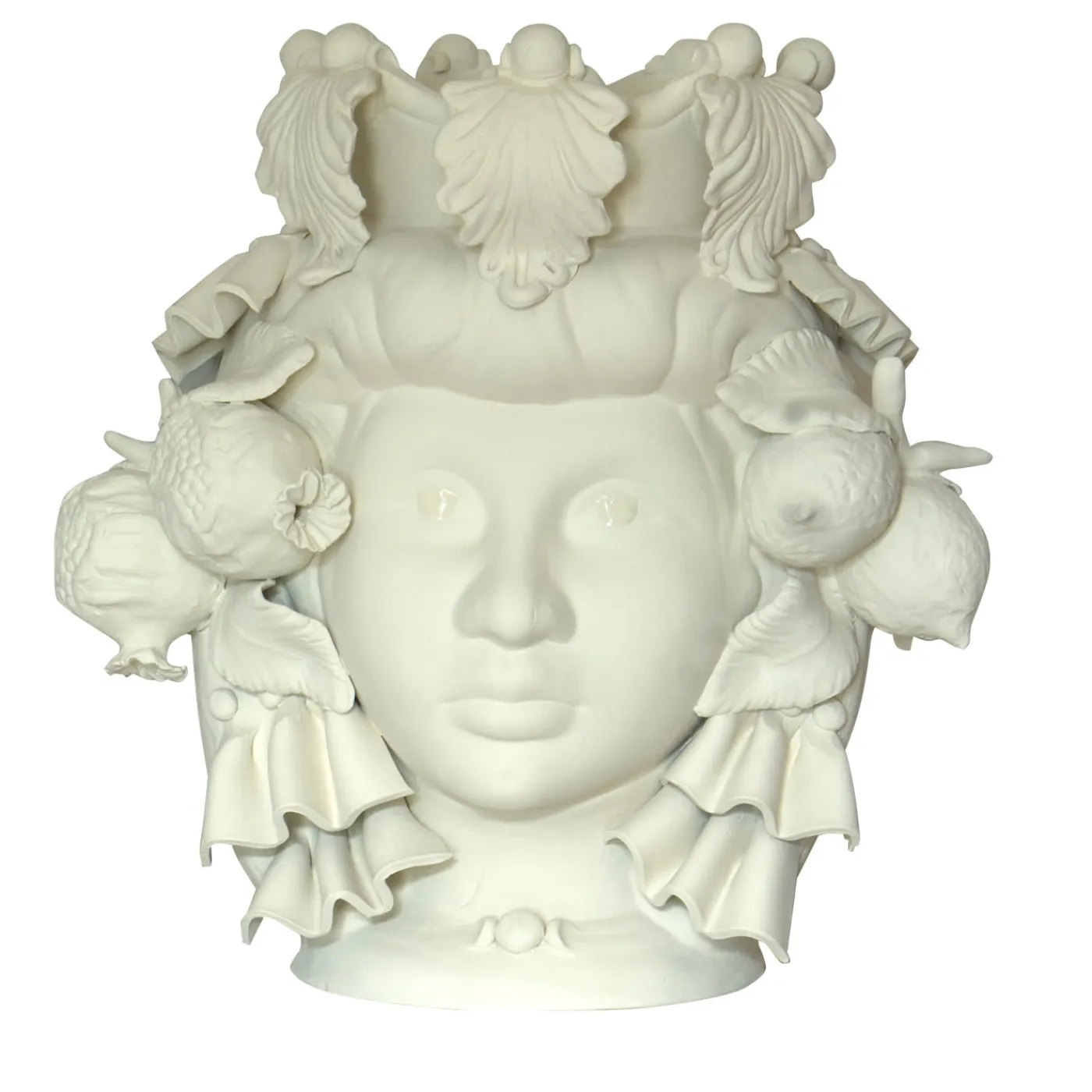 Questo vaso antropomorfo è realizzato interamente a mano e dipinto in una tinta monocromatica avorio opaca, ricca di pigmenti naturali e leganti resinosi che conferiscono un’intensa profondità cromatica. Solo gli occhi sono smaltati per farli risaltare, enfatizzando la bellezza dello sguardo. Il pezzo si ispira alle antiche leggende siciliane di amore e vendetta tra un moro e una fanciulla. Il vaso non può essere riempito d’acqua.