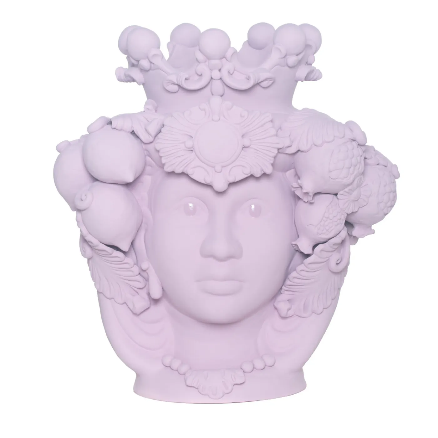 Questo vaso antropomorfo è realizzato interamente a mano e dipinto in una tinta monocromatica opaca rosa antico, ricca di pigmenti naturali e leganti resinosi che conferiscono un’intensa profondità cromatica. Solo gli occhi sono smaltati per farli risaltare, enfatizzando la bellezza dello sguardo. Il pezzo si ispira alle antiche leggende siciliane di amore e vendetta tra un moro e una fanciulla. Il vaso non può essere riempito d’acqua.