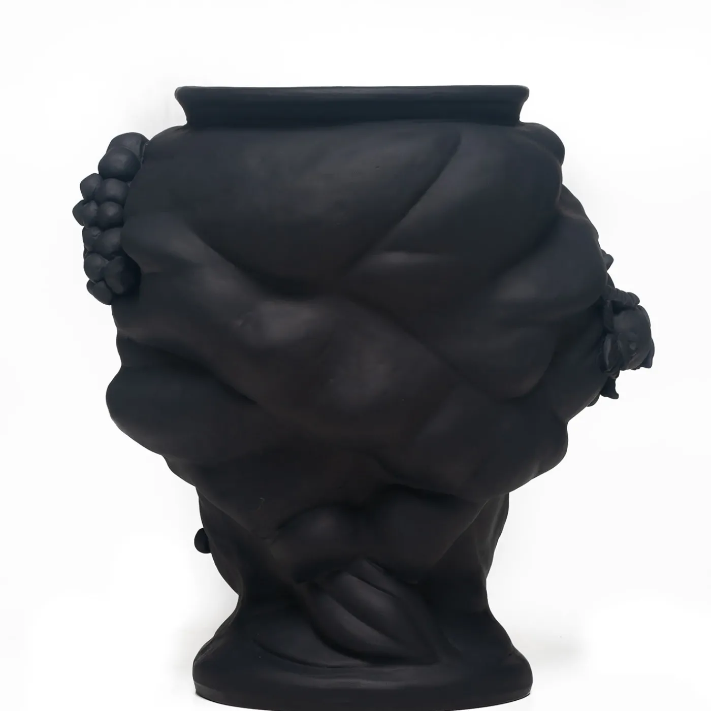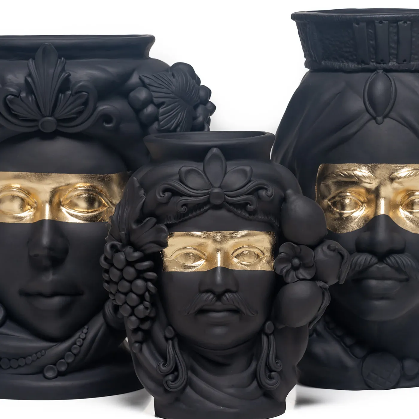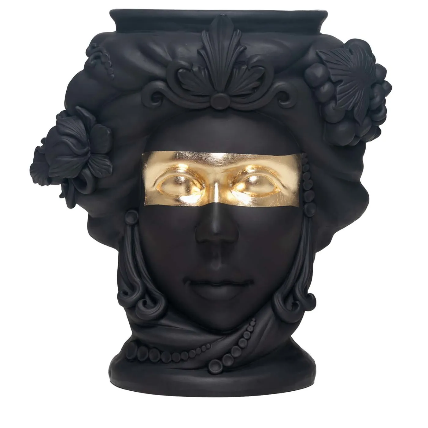 La grandezza della dominazione araba in Sicilia è celebrata in questo vaso antropomorfo in terracotta che raffigura una donna siciliana, realizzato a mano dalla maestra ceramista Stefania Boemi. La ceramica è smaltata a mano in un profondo nero opaco che esalta il volto espressivo della donna e il suo ornato copricapo e corona, da cui spuntano ciocche di capelli intrecciate con limoni siciliani. Una fascia di lamina d’oro attraversa orizzontalmente gli occhi della donna, un dettaglio suggestivo che sottolinea il suo sguardo intenso. Il vaso non può essere riempito d’acqua.