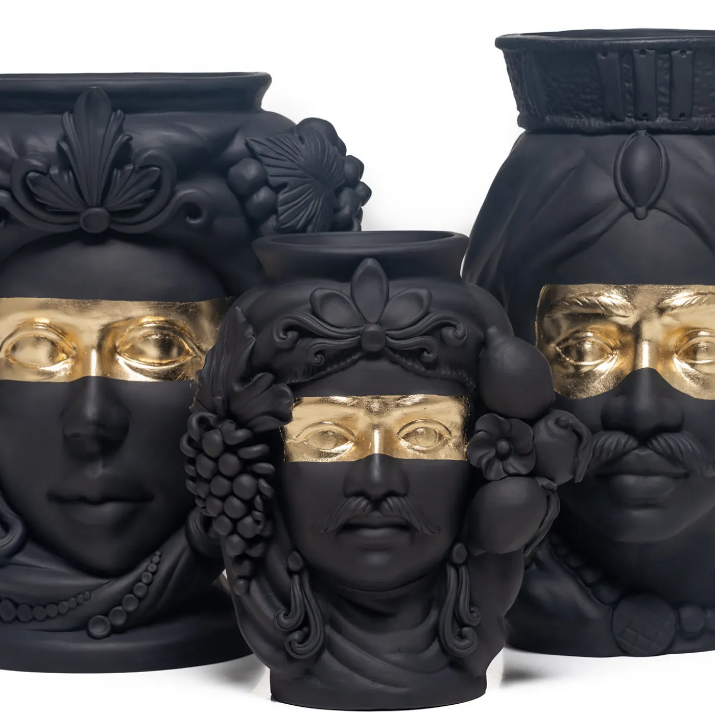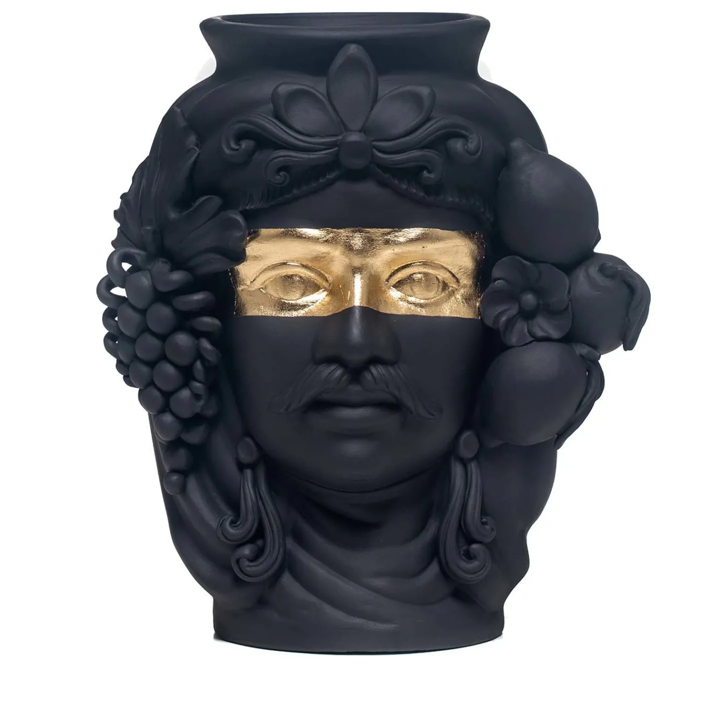 Con la sua collezione di vasi antropomorfi, la ceramista Stefania Boemi rende omaggio alla ricca influenza moresca della Sicilia, reinterpretata in colori monocromatici. Questa rappresentazione di un uomo moro è realizzata a mano in terracotta con uno smalto nero opaco dipinto a mano, per rivelare gli straordinari dettagli decorativi del copricapo ornato con frutti lussureggianti che incorniciano il nobile volto. Una fascia di lamina d’oro sottolinea gli occhi con tonalità calde e scintillanti per aggiungere un accattivante contrasto visivo. Il vaso non può essere riempito d’acqua.