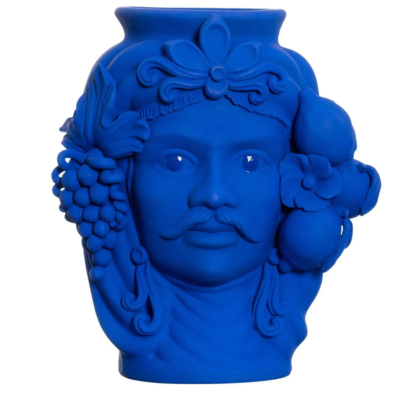 Interpretazione contemporanea delle tradizionali sculture moresche dell’arte siciliana, questo vaso è un’armoniosa combinazione di artigianato e sensibilità moderna. I suoi volumi scultorei e i dettagli naturalistici del volto e delle decorazioni dell’uomo sono squisitamente realizzati a mano e rifiniti con una tonalità blu oltremare opaca, accentuata da una striscia orizzontale in foglia d’oro che segna gli occhi. Quest’opera d’arte può essere utilizzata per esporre fiori o come scultura unica in una casa contemporanea o eclettica. Il vaso non può essere riempito d’acqua.