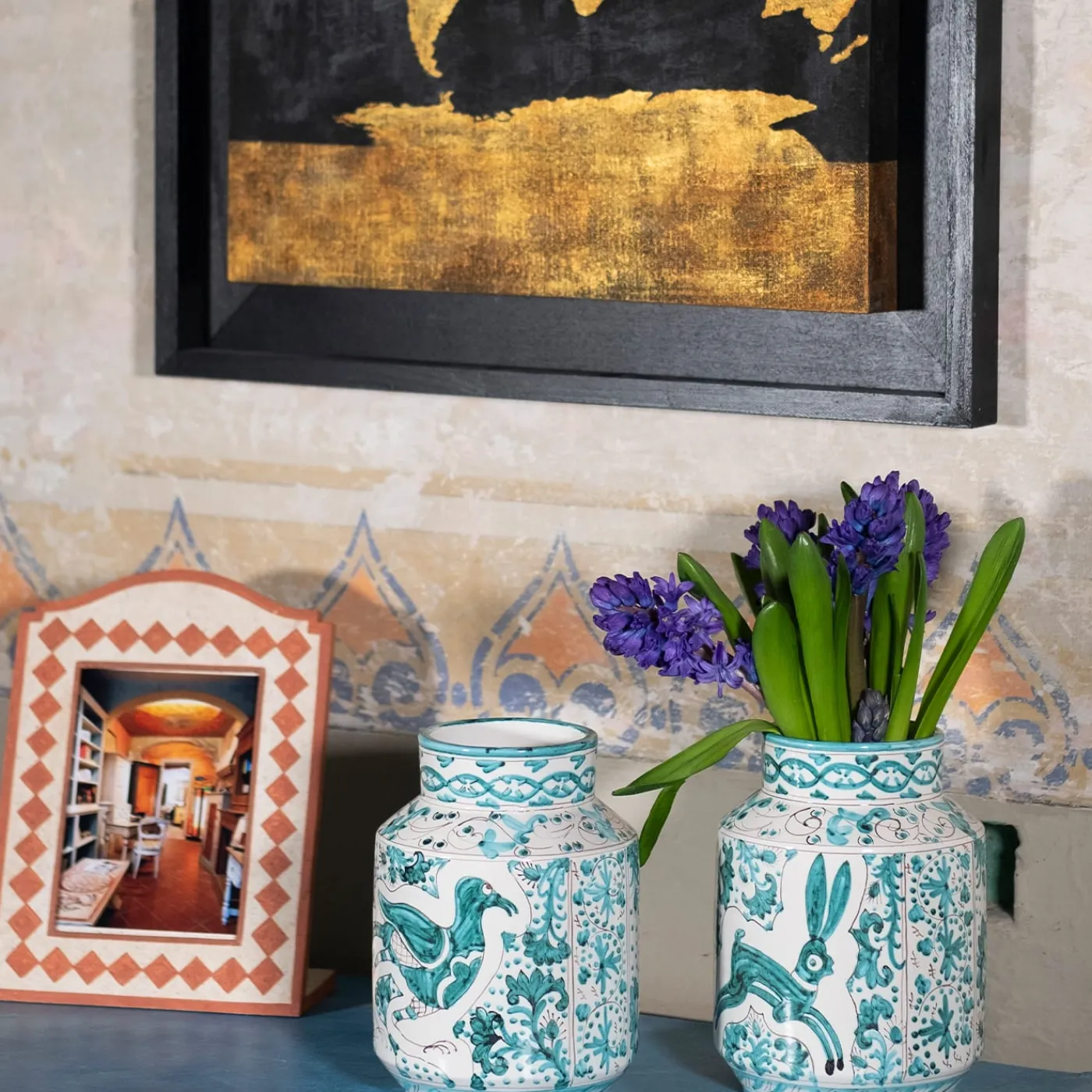 Splendidamente decorato a mano con brillanti sfumature d’oro secondo le antiche tecniche artigianali fiorentine, questo superbo arazzo incorniciato decorerà qualsiasi interno in stile classico o moderno. Realizzato in lino grezzo con colle e pigmenti naturali, è racchiuso in una cornice di legno nero, laccata con colori acrilici e rifinita con cera d’api naturale.