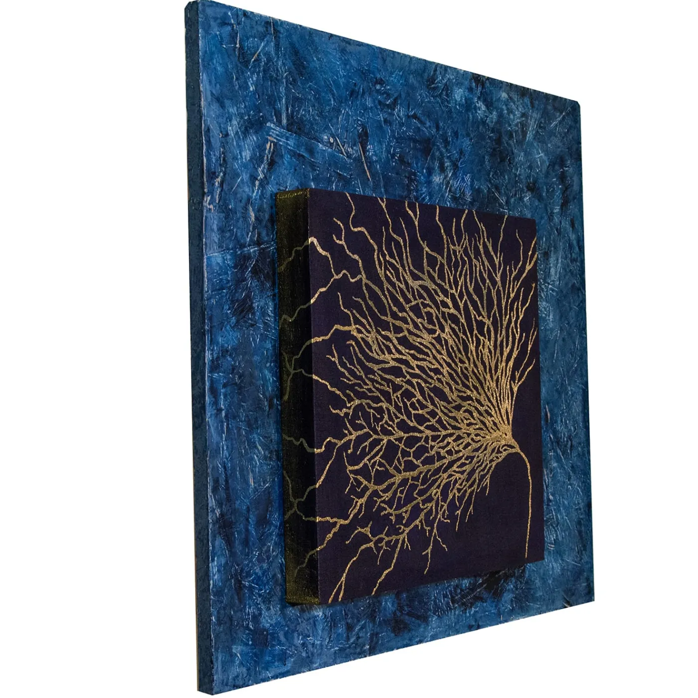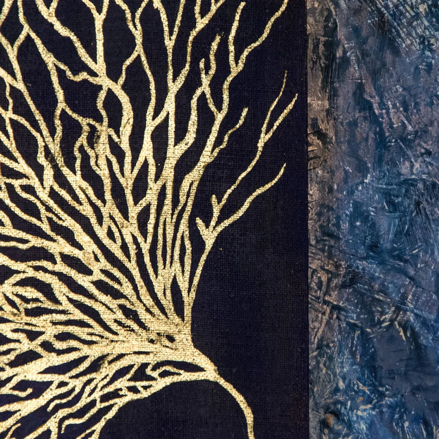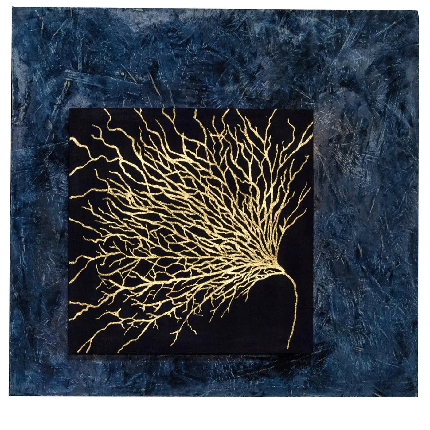 Splendida opera d’arte che aggiungerà raffinatezza a una zona living contemporanea, questo dipinto è realizzato a mano su una tela di lino, trattata con colla naturale secondo tecniche antiche. Immerso in uno sfondo blu intenso, un corallo lucente è reso con una preziosa foglia d’oro. Il telaio di supporto è in legno OSB, laccato a spatola in un incredibile gioco di sfumature. Rifinito con cera d’api.