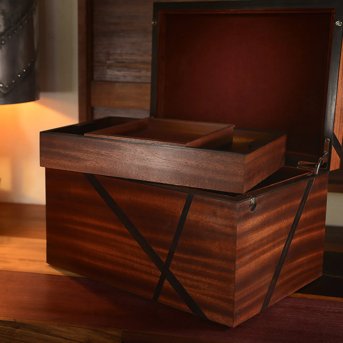 Questo elegante cofanetto è realizzato in mogano massiccio, con inserti decorativi in ebano. Foderato in velluto, l’interno contiene due grandi vassoi e un vassoio scorrevole più piccolo, tutti dotati dello stesso morbido rivestimento in velluto. Caratterizzata da una ricca tonalità marrone, la scatola in mogano ed ebano è un complemento decorativo e al tempo stesso ultra-funzionale per la casa.