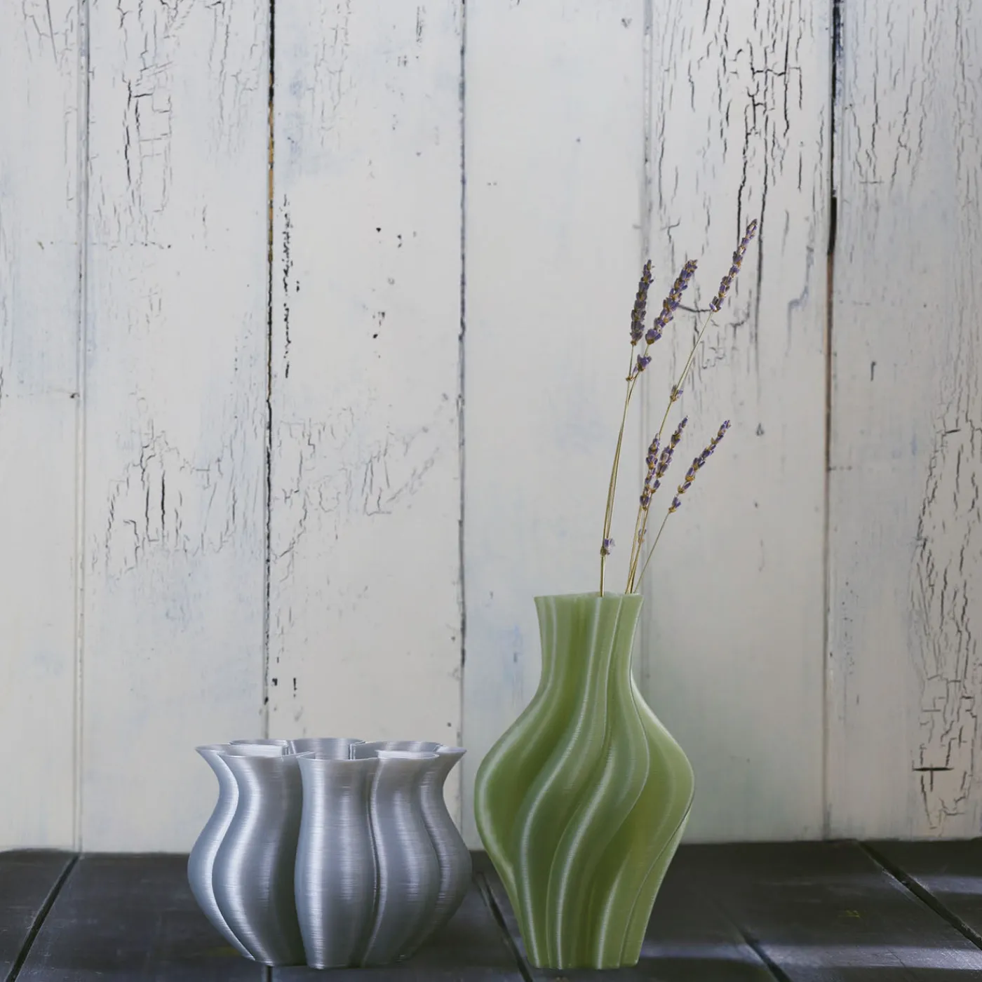 Il Set Quorifolium presenta due vasi distinti ispirati ai simboli dell’amore e della fortuna: un vaso più alto (h. 16 cm) con linee verticali richiama i petali del quadrifoglio e uno più compatto (h. 9 cm) presenta un’apertura a forma di quattro cuori. Entrambi includono un contenitore interno in vetro per mantenere la freschezza dei fiori. Disponibili in vari colori, questi pezzi sono progettati per uso interno e richiedono una pulizia delicata con un panno umido. Si raccomanda di evitare la luce diretta del sole. Questi vasi sono realizzati in PLA (acido polilattico di origine vegetale) tramite stampa 3D.