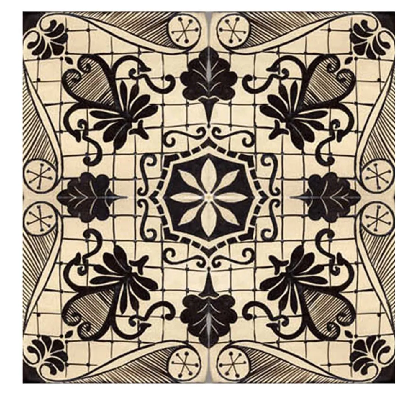 Dalla Collezione Natura, con motivi naturali, questa piastrella sarà un murale o un pavimento di grande effetto in un ingresso, in una toilette o in un bagno di una casa rustica. Interamente dipinte e smaltate a mano, queste piastrelle presentano un intricato disegno rivelato in quattro piastrelle. Il disegno presenta motivi a fronde su uno sfondo avorio con una sinuosa cornice nera. La griglia sottostante aggiunge un tocco di linearità visiva che esalta la maestria del pezzo. Realizzate in terracotta mista a pietra vulcanica macinata, queste piastrelle devono essere applicate senza stuccatura per garantire la continuità del disegno.