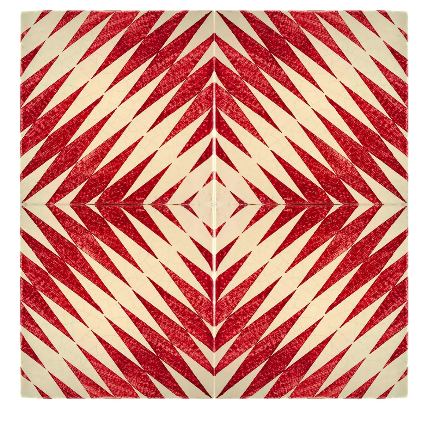 Profondamente radicata nelle tradizioni artistiche, questa piastrella di ispirazione moresca è resa poeticamente dai maestri artigiani dello Studio Le Nid, storico laboratorio siciliano specializzato in maioliche. Completamente realizzata a mano e smaltata, questa piastrella presenta un motivo a forma di diamante allungato di colore avorio che emerge dal vibrante sfondo rosso. Questa giustapposizione di colori e forme rivela una forma di diamante più grande che ricorda le forme speculari di un caleidoscopio. Adatta a una cucina, a un bagno o a un patio a bordo piscina, questa piastrella deve essere applicata con una stuccatura minima per garantire la continuità del design.