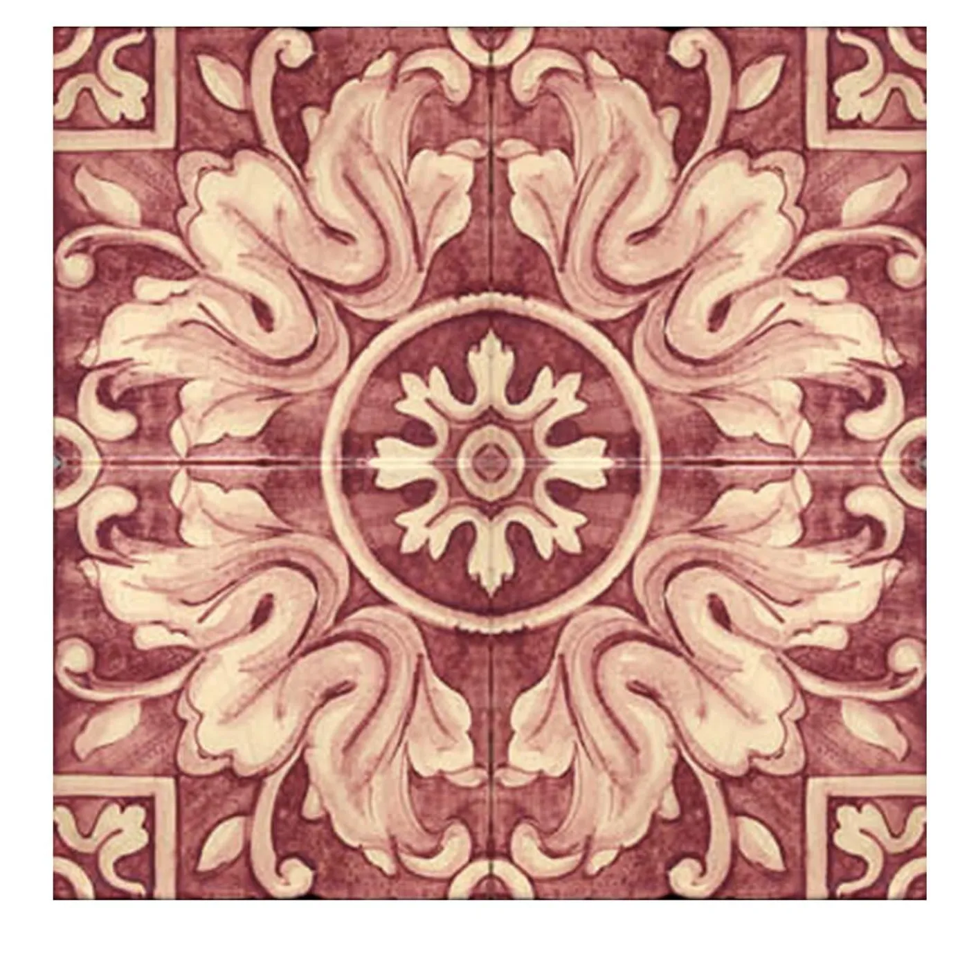 Illustrazione dinamica dell’arte della maiolica siciliana, queste piastrelle saranno un pezzo forte che eleverà qualsiasi arredamento con la sua qualità rustica e artigianale. Dalla Collezione Natura, queste quattro piastrelle ornate si fondono per rivelare uno splendido disegno che ricorda l’arte decorativa del tardo Rinascimento. Il disegno a specchio è dominato da una serie di audaci fronde e motivi di foglie che creano una gamma dinamica di forme e colori, vorticando intorno a un motivo floreale centrale. I motivi in tonalità avorio e le delicate forme d’accento negli angoli risaltano sul vivace sfondo rosso. Ideale da esporre in bagno o in cucina.