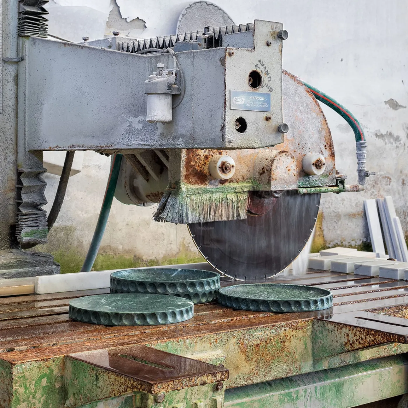 La collezione Mirage nasce dalla matericità monolitica della pietra. Forma e funzione coincidono, creando un elemento senza fronzoli, che nasce dalla sottrazione di materiali. Spazi pieni e vuoti si alternano tra loro e creano sfumature di luce che si dissolvono grazie all’accostamento dei decori. È un contenitore di oggetti pieno di ciò che lo circonda e che si riflette sulla sua superficie.