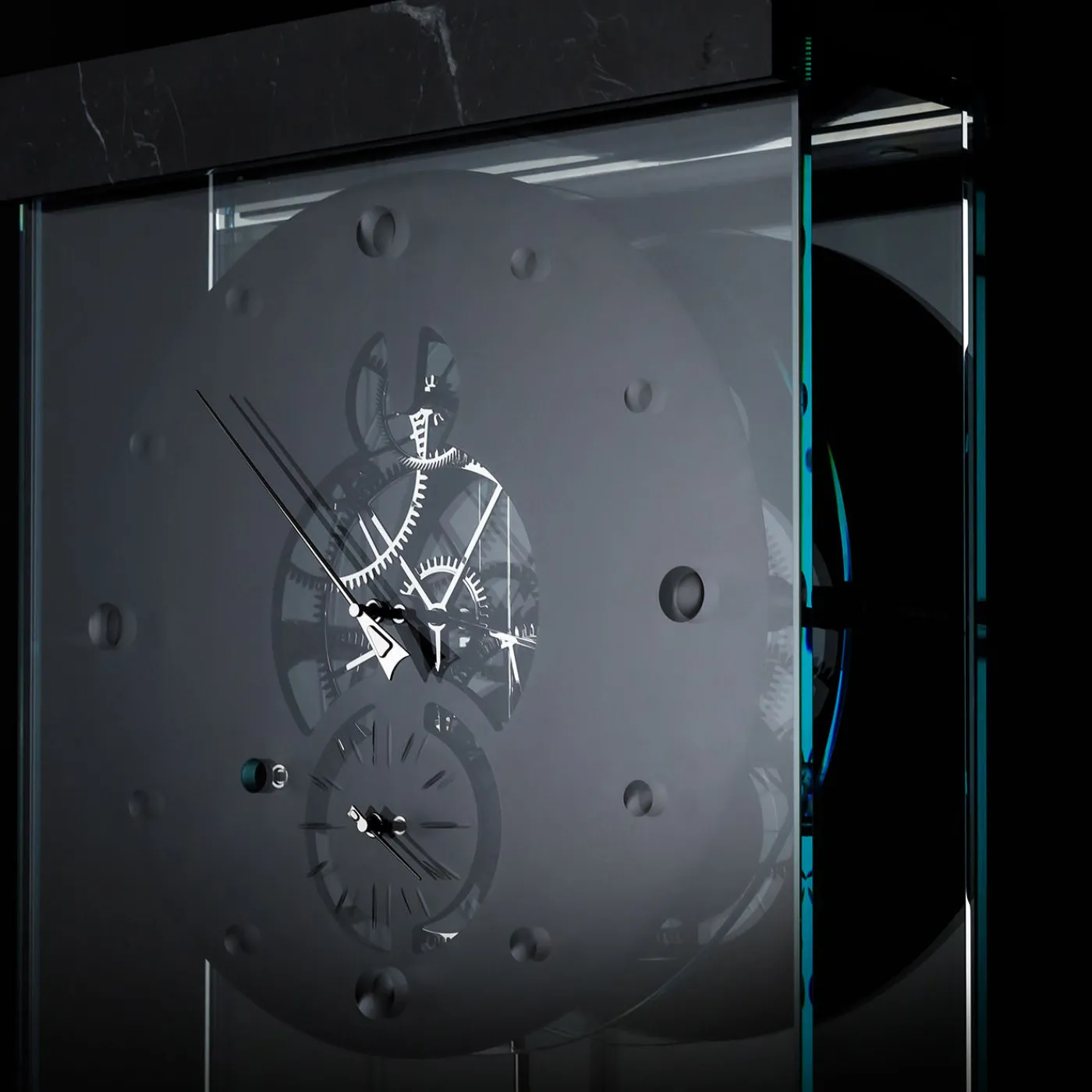 Takto Adagio presenta una base e un telaio in marmo Marquina nero. Il disco del quadrante è fresato da un unico blocco di alluminio e rifinito con guilloché anodizzato nero. La sua struttura in vetro temperato extra-chiaro spesso 15 mm espone indici delle ore e dei minuti finemente incisi e lucidi. Alimentato da un movimento meccanico con un escapement Graham, il meccanismo interno include ingranaggi e pignoni in ottone rivestiti di palladio. Con una riserva di carica di 30 giorni, una frequenza di 3.600/h e un peso di carico di 2,4 kg, TAKTO ADAGIO unisce ingegneria di precisione a un’estetica raffinata.