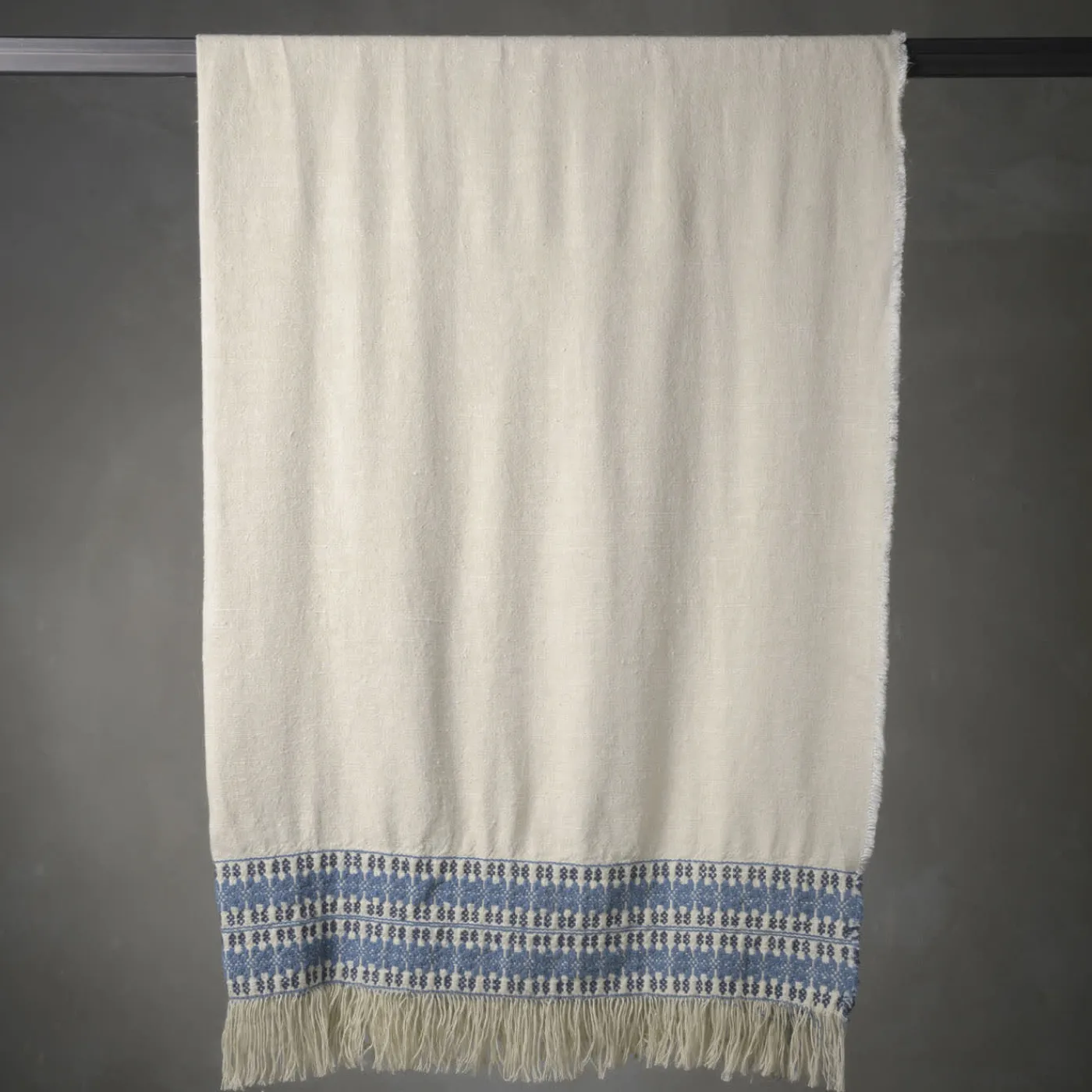 Un trionfo di ricami minuti raccolti in un motivo denso e fresco caratterizza questa coperta leggera come un singolare capolavoro artigianale. Ulteriormente ornata da lunghe frange lungo i suoi profili, la trama generale di colore beige distilla una luminosità naturale che ben si abbina alle ricche tonalità di blu sfoggiate dai ricami.