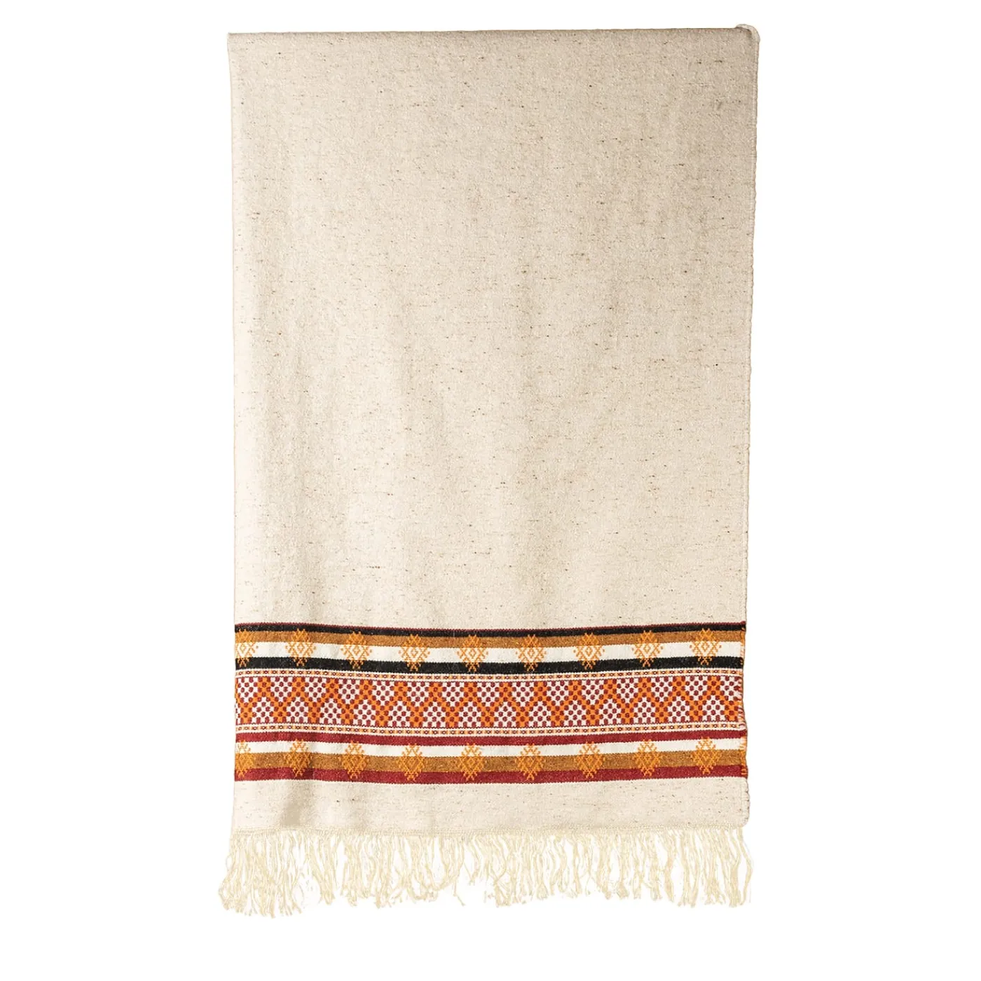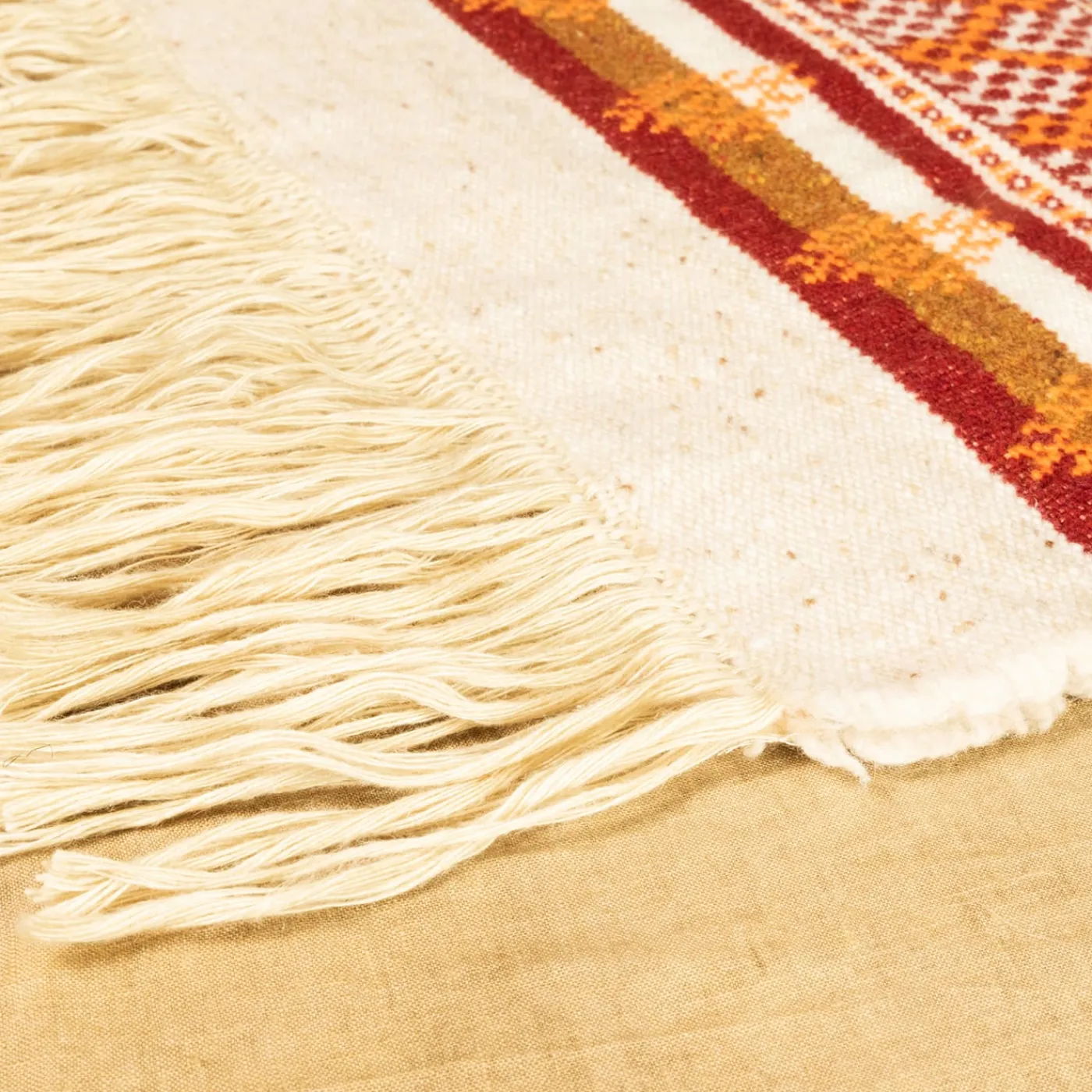 Ipnotizzante nelle sue linee, nei suoi punti e nell’audace palette di colori che evoca caldi scenari esotici, una squisita fantasia contraddistingue questa tranquilla coperta beige con frange. È una soluzione preziosa per aggiungere personalità a divani o poltrone altrimenti monotoni e si offre come una soluzione affidabile in cui accoccolarsi. La sua miscela combina il 49% di lana vergine, il 38% di lino e il 13% di poliammide.