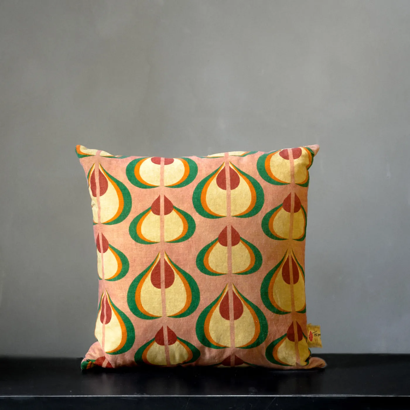 Un sublime mix di cotone e lino, questo cuscino quadrato si distingue per la sua stampa vivace e i suoi materiali eccezionali. I toni vibranti del verde, dell’arancione e del rosso si combinano con le delicate sfumature del rosa e del beige, una palette cromatica che aggiunge un ulteriore tocco di personalità al motivo che ricorda vagamente le mongolfiere.