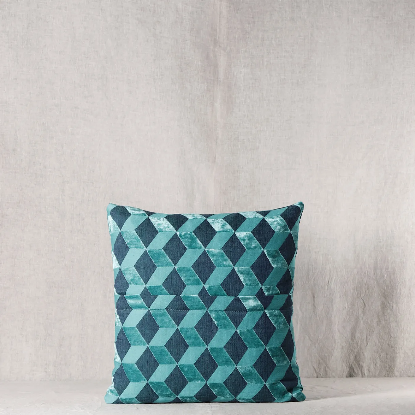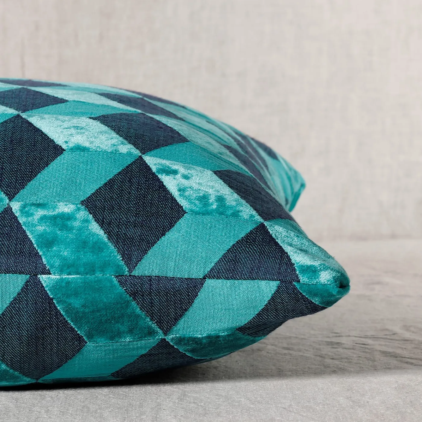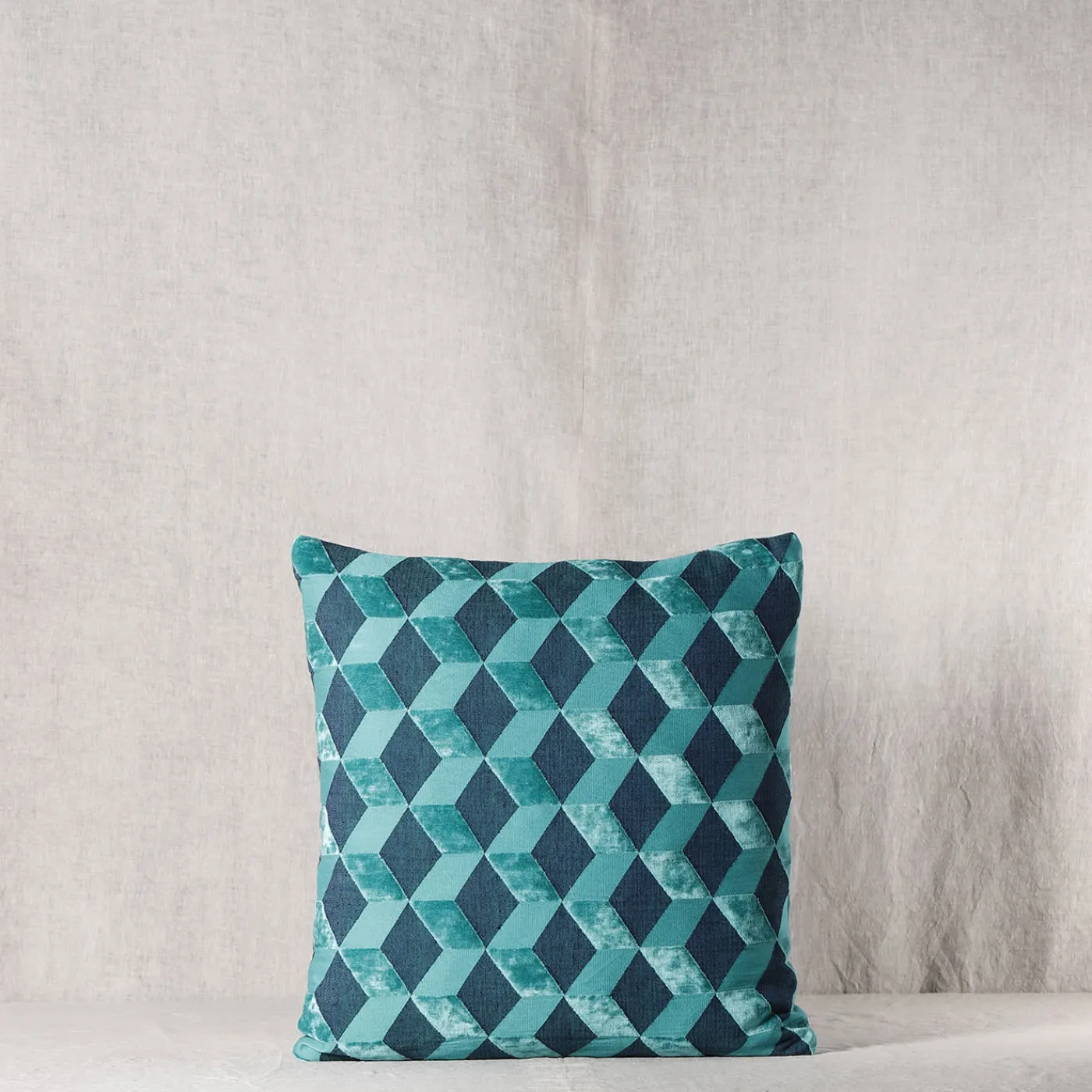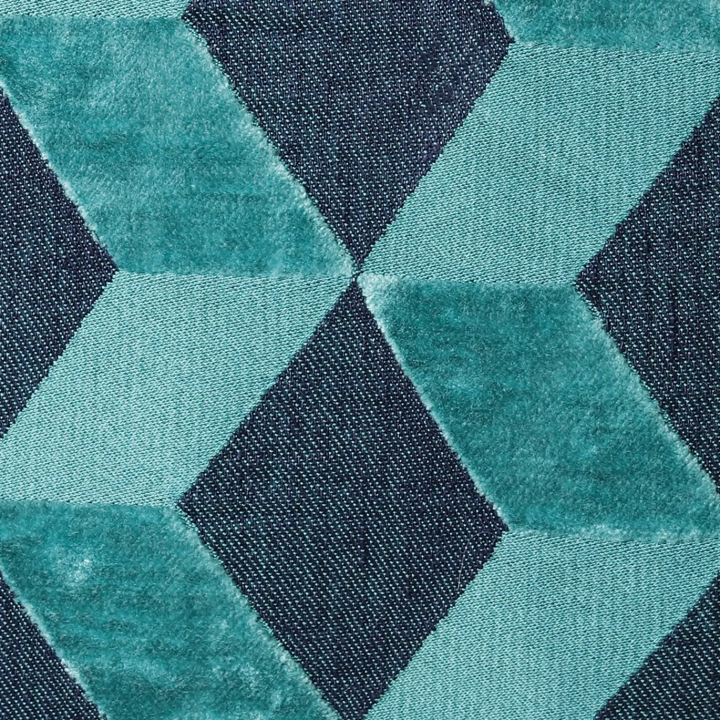 Il cuscino Rischio è un mosaico di jacquard in cotone, lino e viscosa, un collegamento armonico tra tessuto e ceramica. Il colore turchese ricorda la gemma semipreziosa che decorava i pavimenti dei maestosi bagni ottomani.