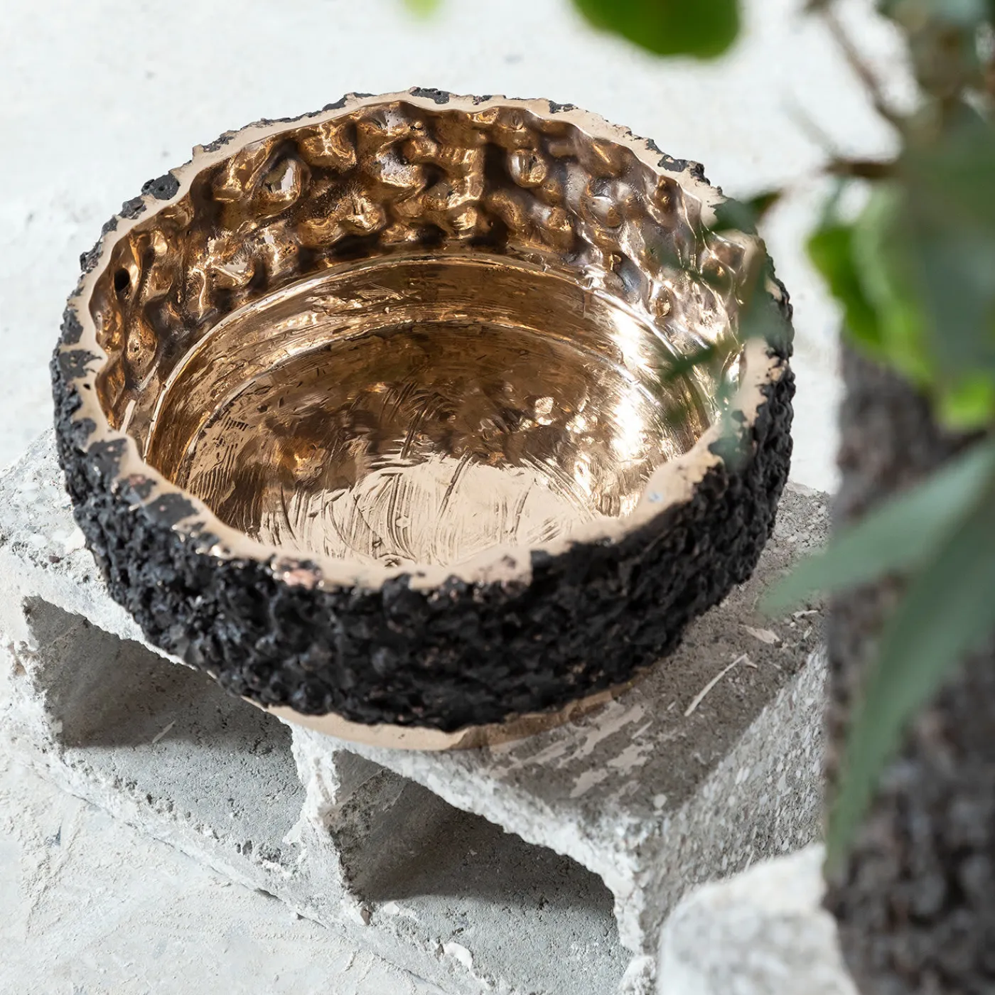 Innalzato su una base incassata in ottone lucido, questo vaso è realizzato con scorie dalla forma rotonda e bassa, con un esterno strutturato che ricorda la corteccia di un albero e un interno liscio rifinito in bronzo lucido. Questo affascinante pezzo di arredamento funzionale appartiene alla Collezione Secondo Fuoco, un progetto innovativo basato sull’idea di recuperare i residui di fusioni passate (scorie), meticolosamente selezionati e rifusi in una “seconda fiamma” (“secondo fuoco” in italiano) con il bronzo fuso come legante. Ogni pezzo presenterà leggere variazioni, a testimonianza della sua originalità.