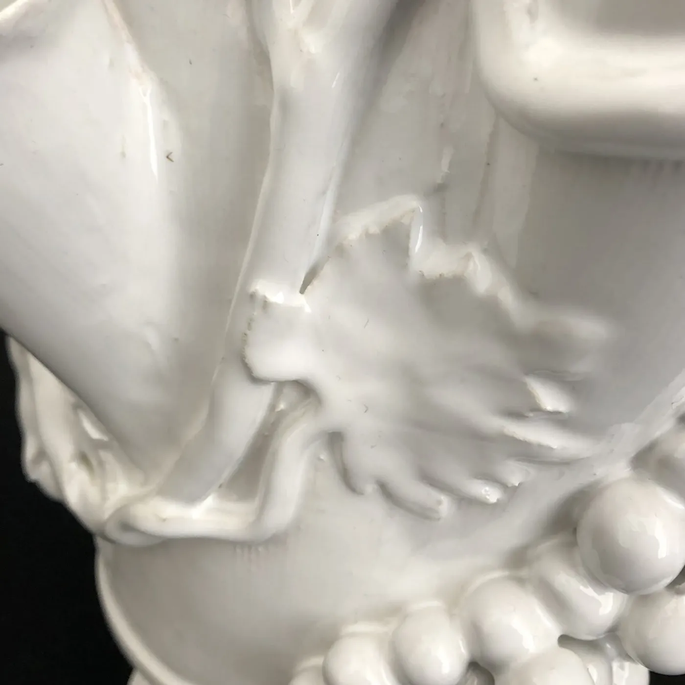 Ispirato a un antico vaso del XIX secolo trovato nella casa di campagna di famiglia, questo vaso a 5 tulipani ha la parte centrale in terracotta bianca tornita a mano, smaltata internamente ed esternamente in bianco prima della seconda cottura. Ogni pezzo è unico e le irregolarità dei viticci e degli acini ne attestano l’autenticità.