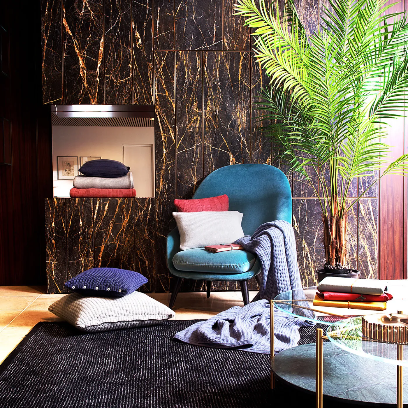 L’intreccio e il cashmere di prima qualità sono gli elementi che caratterizzano il prestigio e il valore di questa coperta proposta in una versatile tonalità di blu Air Force. Come runner di lusso posizionato in fondo al letto o come oggetto puramente decorativo srotolato su un divano, questo copriletto incanta per il suo disegno a maglia a sei fili che offre un piacevole effetto tattile al tatto.