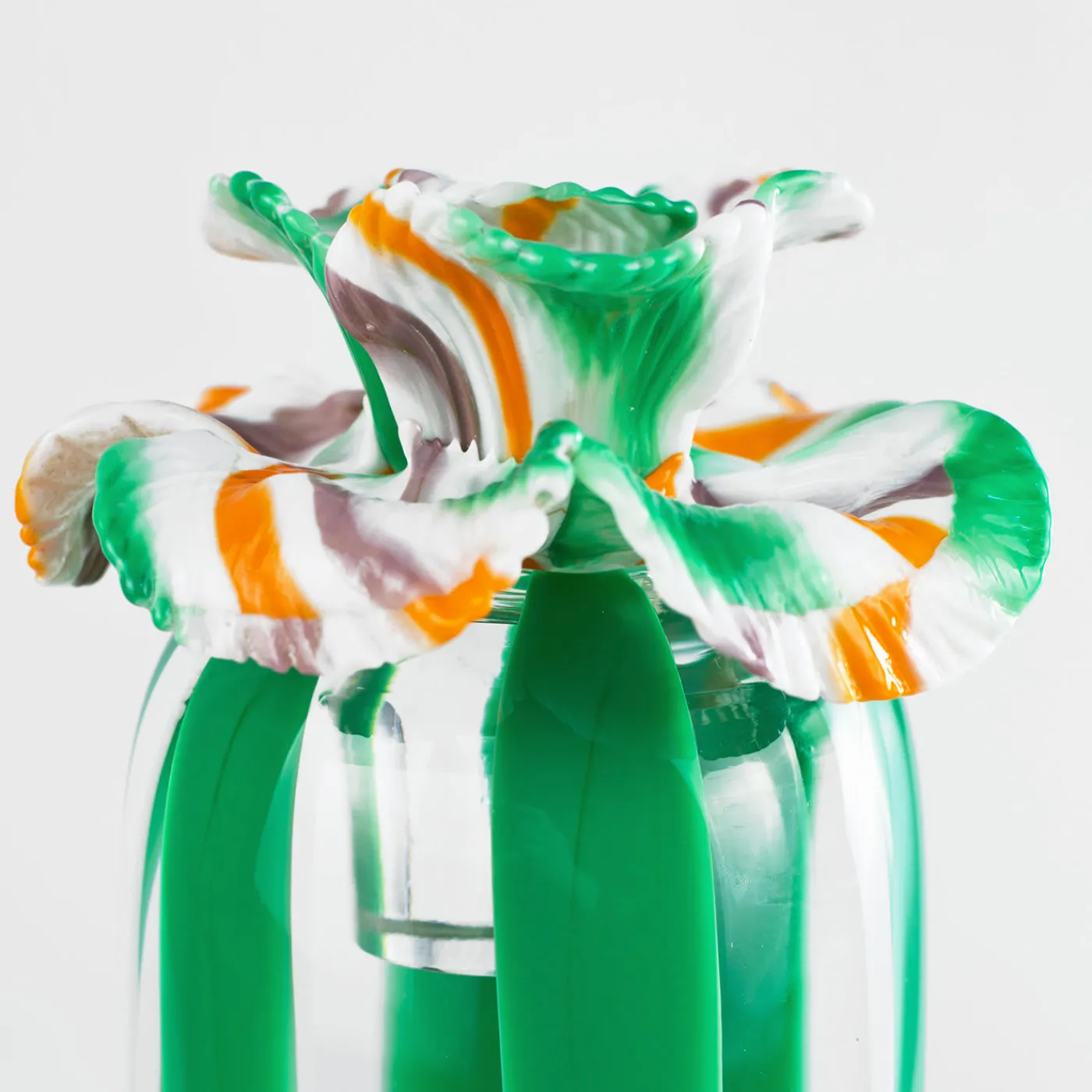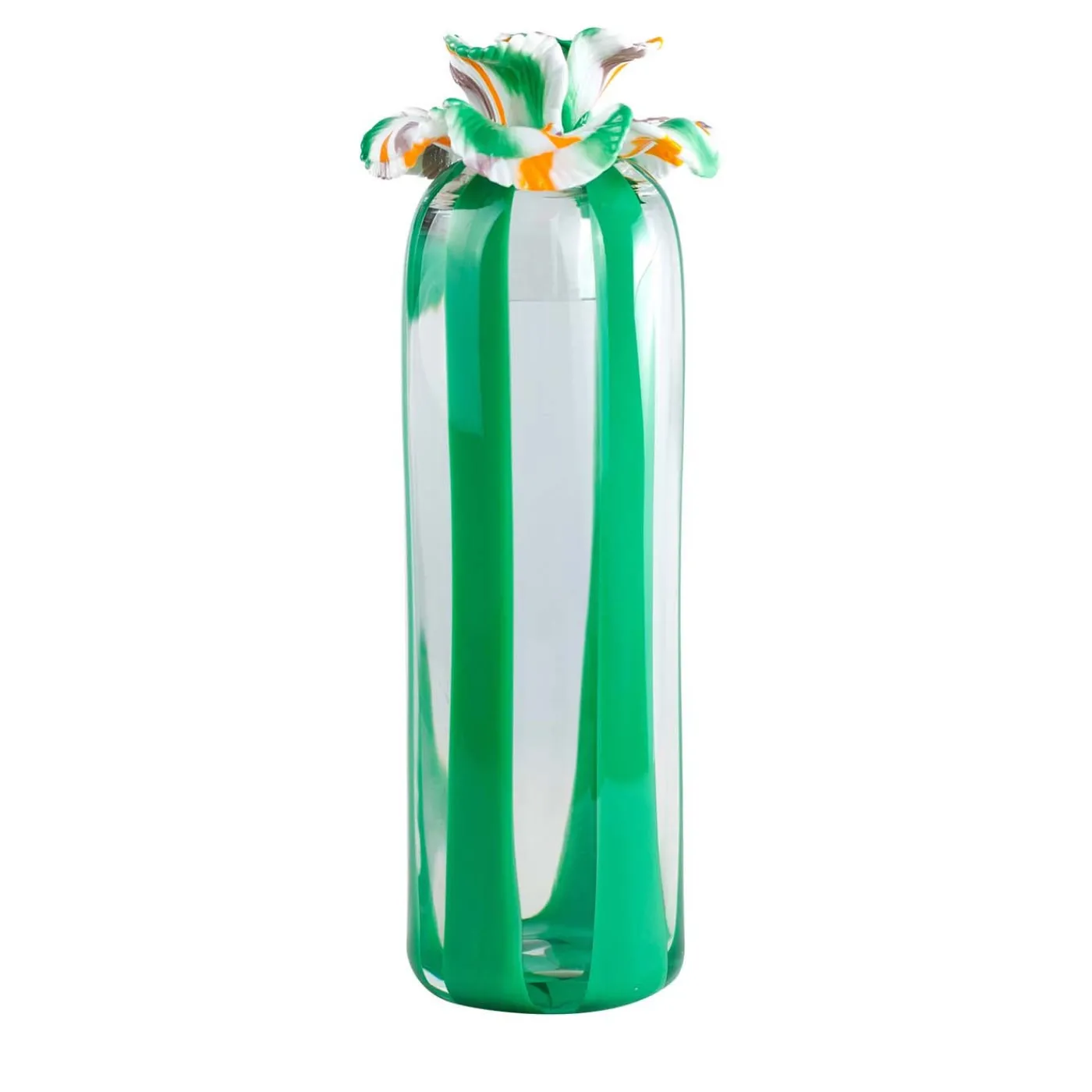 Dalla collezione Rigadoni, questa scultura è caratterizzata da strisce verticali verde brillante su vetro trasparente. A chiudere il vaso è un fiore di Torcelo, realizzato a strisce bianche, corallo, verdi e malva. Strettamente decorativo, il pezzo fonde perfettamente la tradizione con il gusto contemporaneo, rendendolo facile da esporre in qualsiasi contesto di design.