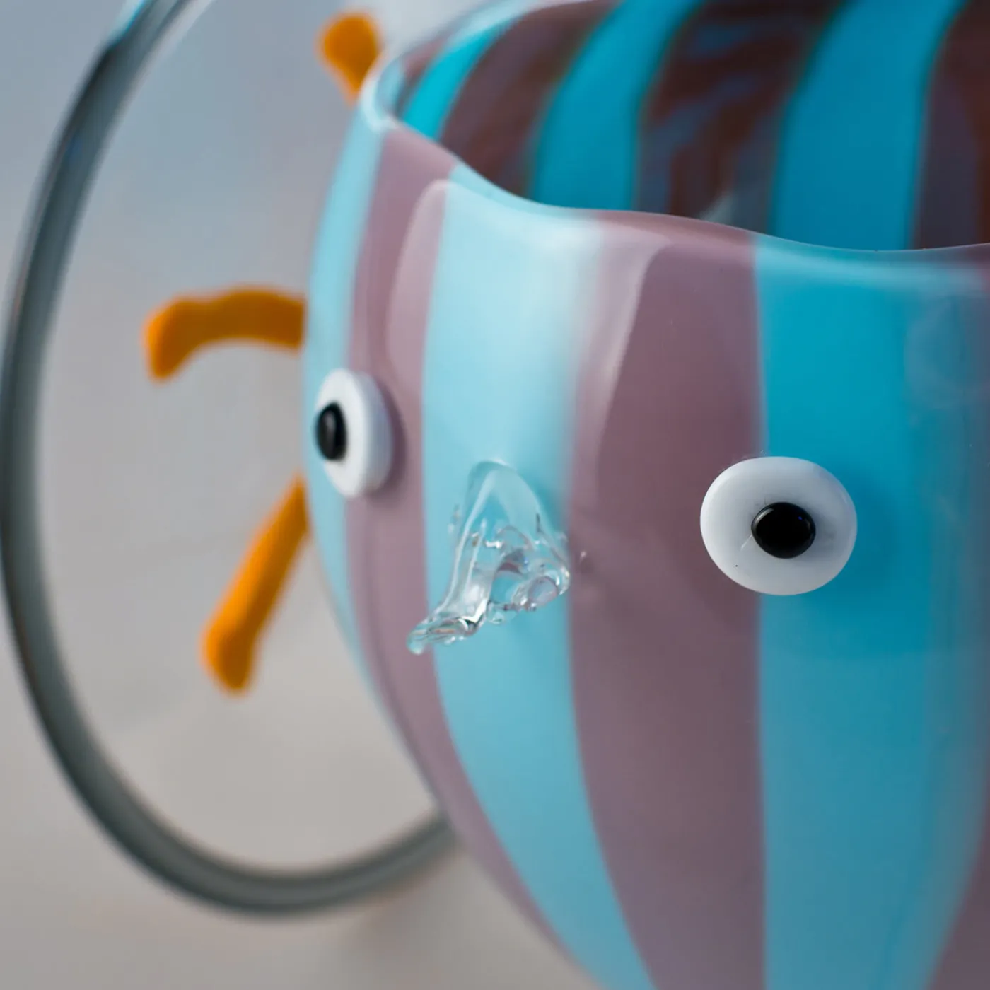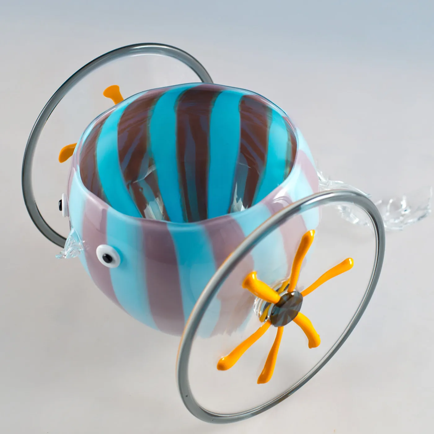 Disegnato da Eliana Gerotto e realizzato da Gianni Seguso, Chariot è una sorprendente rivisitazione della tradizione veneziana, che mescola memoria e tecnica con ironia e un pizzico di pop. In vetro blu e malva, il vaso è sospeso in aria da due ruote in arancione e grigio. Il pezzo è completato da un volto stravagante, con un naso ispirato ai lampadari Rezzonico.
