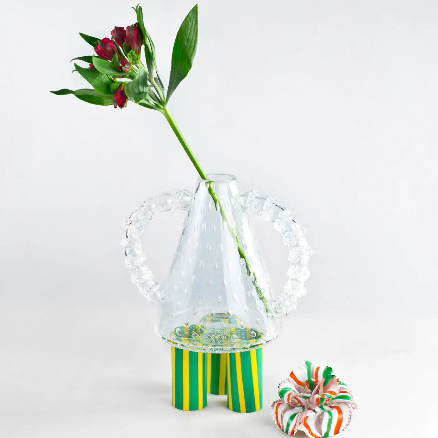 Una scultura ispirata ai primi lampadari in vetro veneziani realizzati nel XVIII secolo. Il corpo è caratterizzato da una trappola d’aria in baloton, i bracci sono realizzati a imitazione dei bracci dei lampadari e le gambe sono realizzate in giallo e verde. Il pezzo è sormontato da un fiore di Torcelo in verde, arancio e malva, sapientemente realizzato da un maestro veneziano.