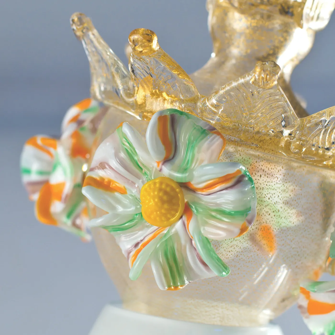 Rezzonica Granda, una serie limitata di dodici pezzi, si ispira agli innovativi lampadari del XVIII secolo, traducendone lo stile in un’imponente forma contemporanea. Con un corpo caratterizzato da una trappola d’aria a balotone, il pezzo poggia su tre colonne nei colori bianco, rosso e malva. I bracci sono decorati con fiori e foglie, mentre la testa è coronata da fiori in stile Torcelo con foglia d’oro.