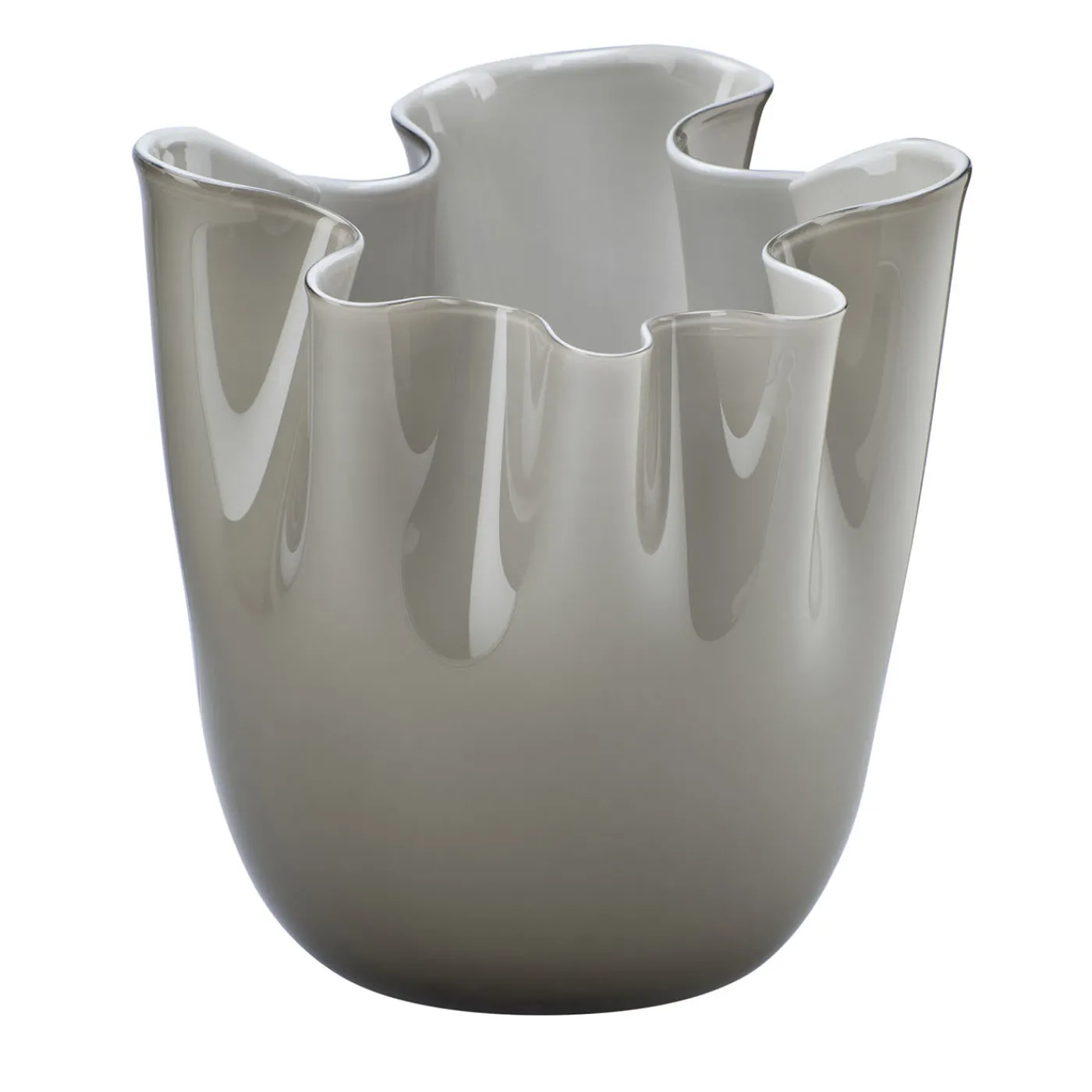 Disegnato da Paolo Venini e Fulvio Bianconi alla fine degli anni Quaranta, questo vaso firmato Fazzoletto si ispira ai fazzoletti di pizzo veneziano che sventolano nella brezza. Con una silhouette smerlata in un elegante color tortora, questo straordinario oggetto d’arte è interamente lavorato a caldo con la tecnica della “mano volante” eseguita a mano libera dai maestri vetrai. Un complemento sofisticato per una sala da pranzo o un salotto chic.