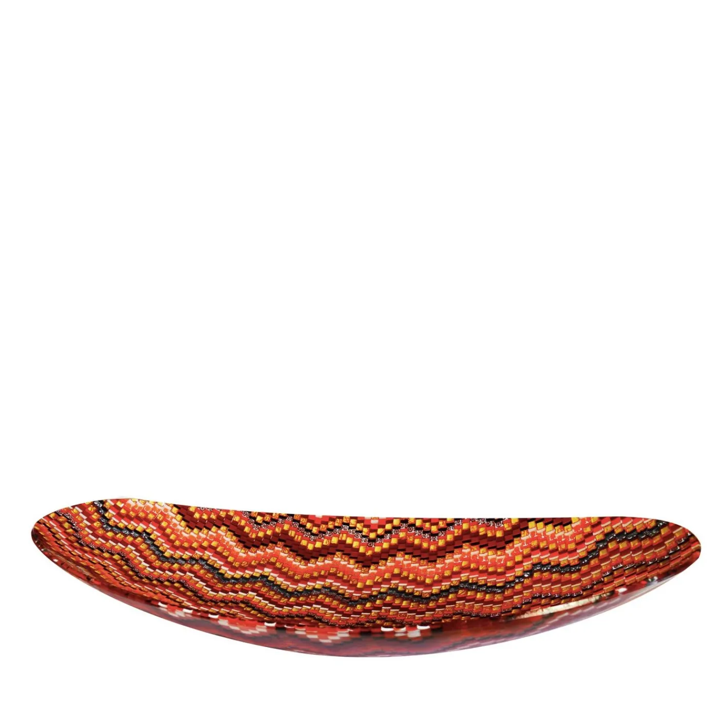 Il centrotavola in vetro di murano Demeter di Andrea Orso presenta una forma ovale realizzata con una tecnica a mosaico, utilizzando piccoli pezzi di vetro colorato tagliati con precisione e disposti in una sequenza cromatica precisa. Adornato con foglie d’oro e perle di murrina veneziana, evoca l’aspetto dei ripari per barche veneziane. Potrebbero verificarsi lievi variazioni nelle dimensioni a causa del dettagliato processo di assemblaggio.
