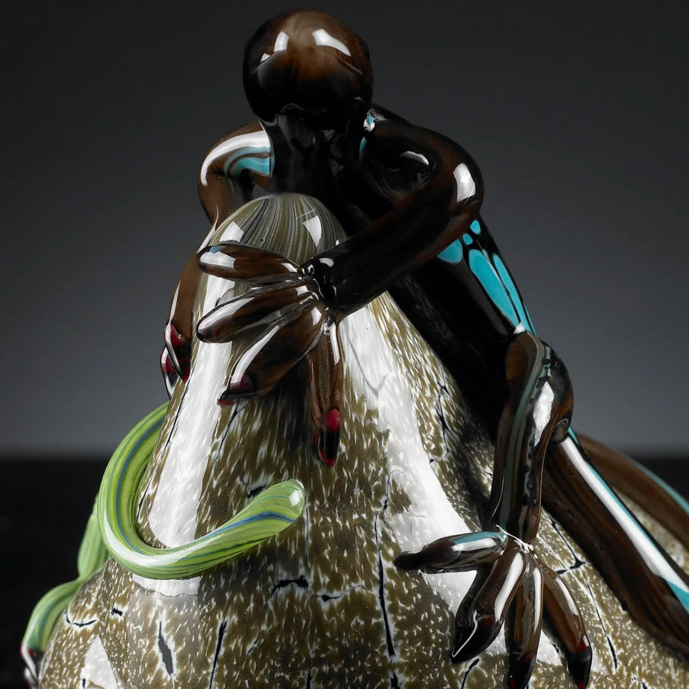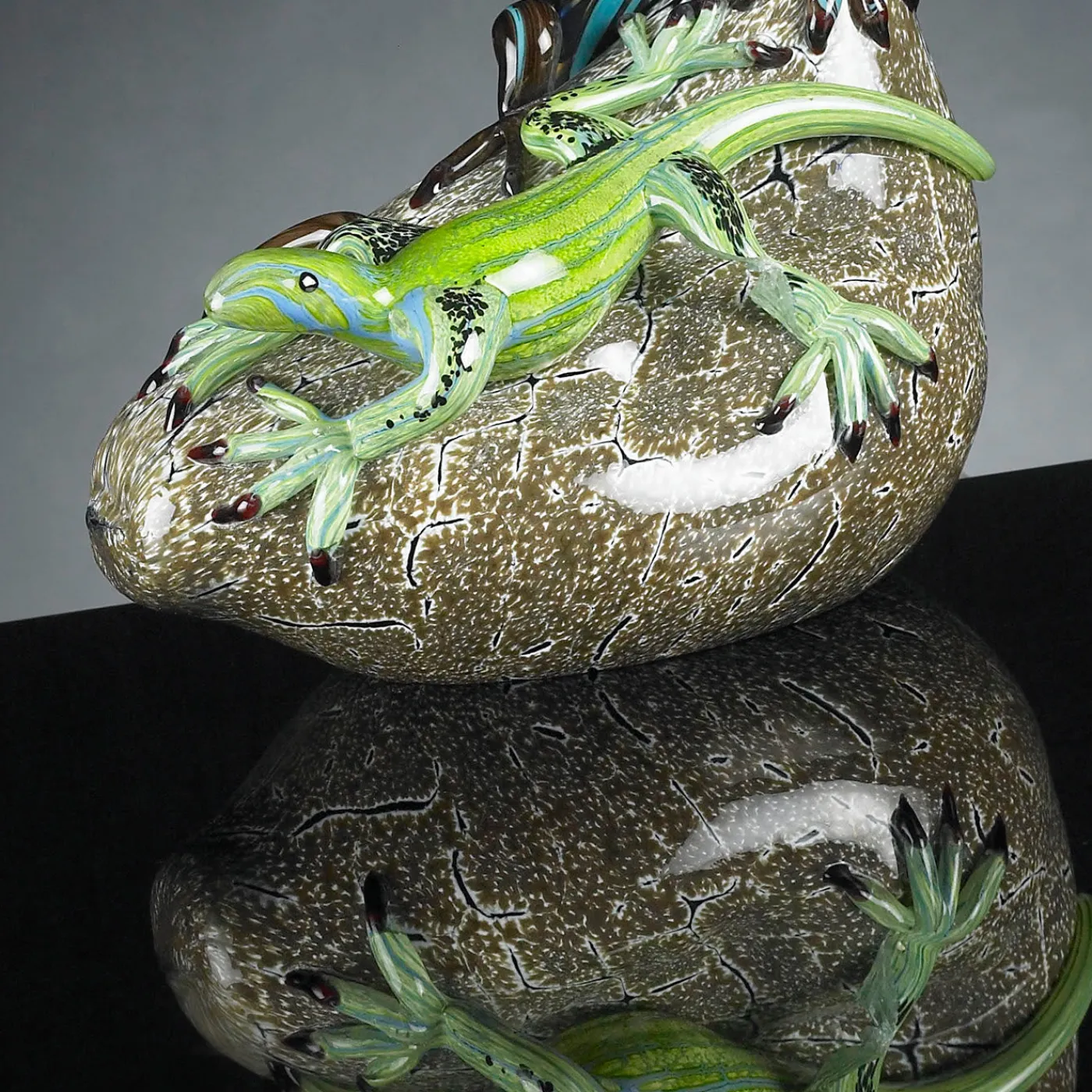 Un affascinante pezzo da collezione, questo oggetto decorativo in vetro raffigura due lucertole verdi che si adagiano su una pietra grigia. Definiti da un tocco scultoreo, i gradienti di colore si fondono magistralmente, conferendo una qualità dinamica a questo pezzo artistico che sicuramente farà la sua figura su una scrivania, una console o un tavolino. Ogni oggetto è soffiato singolarmente per essere unico come chi lo colleziona.