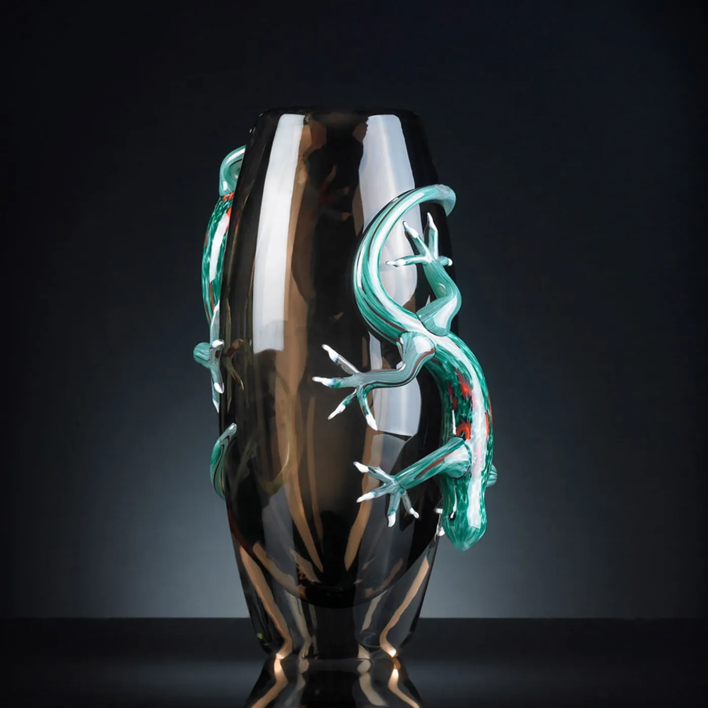 Caratterizzato da un sorprendente uso del colore, questo vaso fa parte di una raffinata serie di oggetti scultorei. Interamente realizzato a mano in vetro con tecniche tradizionali, il suo tocco moderno è dato dall’elegante accostamento delle tonalità del marrone con le vivaci sfumature turchesi dei due gechi che arricchiscono la superficie.