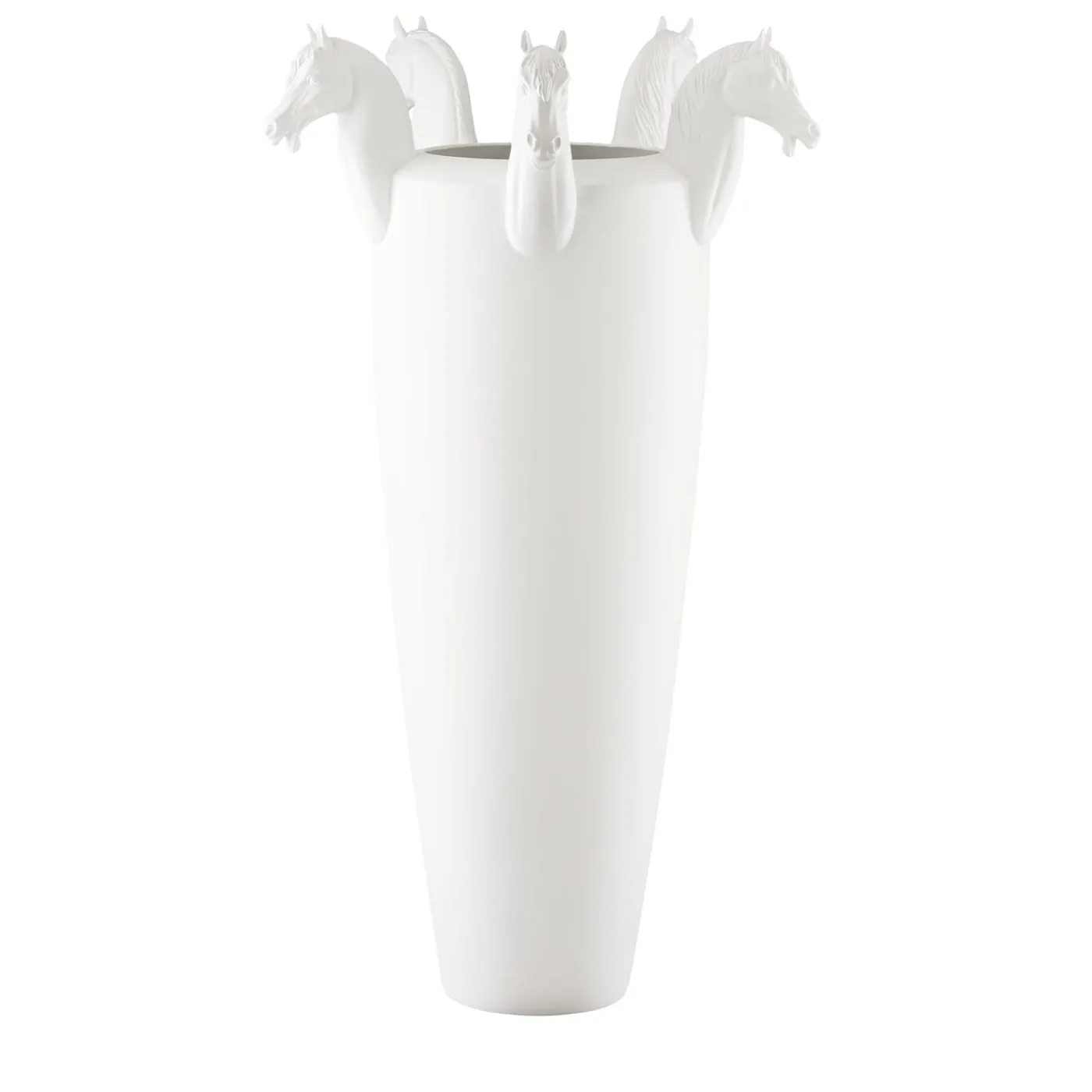 Riferimenti moderni e classici sono sintetizzati senza sforzo in questo iconico vaso decorativo che evoca ferocia ed eleganza. La finitura total white che accentua l’intero corpo ceramico sottolinea lo spirito moderno del pezzo, che si estende anche agli elementi a forma di testa di cavallo che ornano il bordo. Nel catalogo Artemest è disponibile anche una versione più piccola.