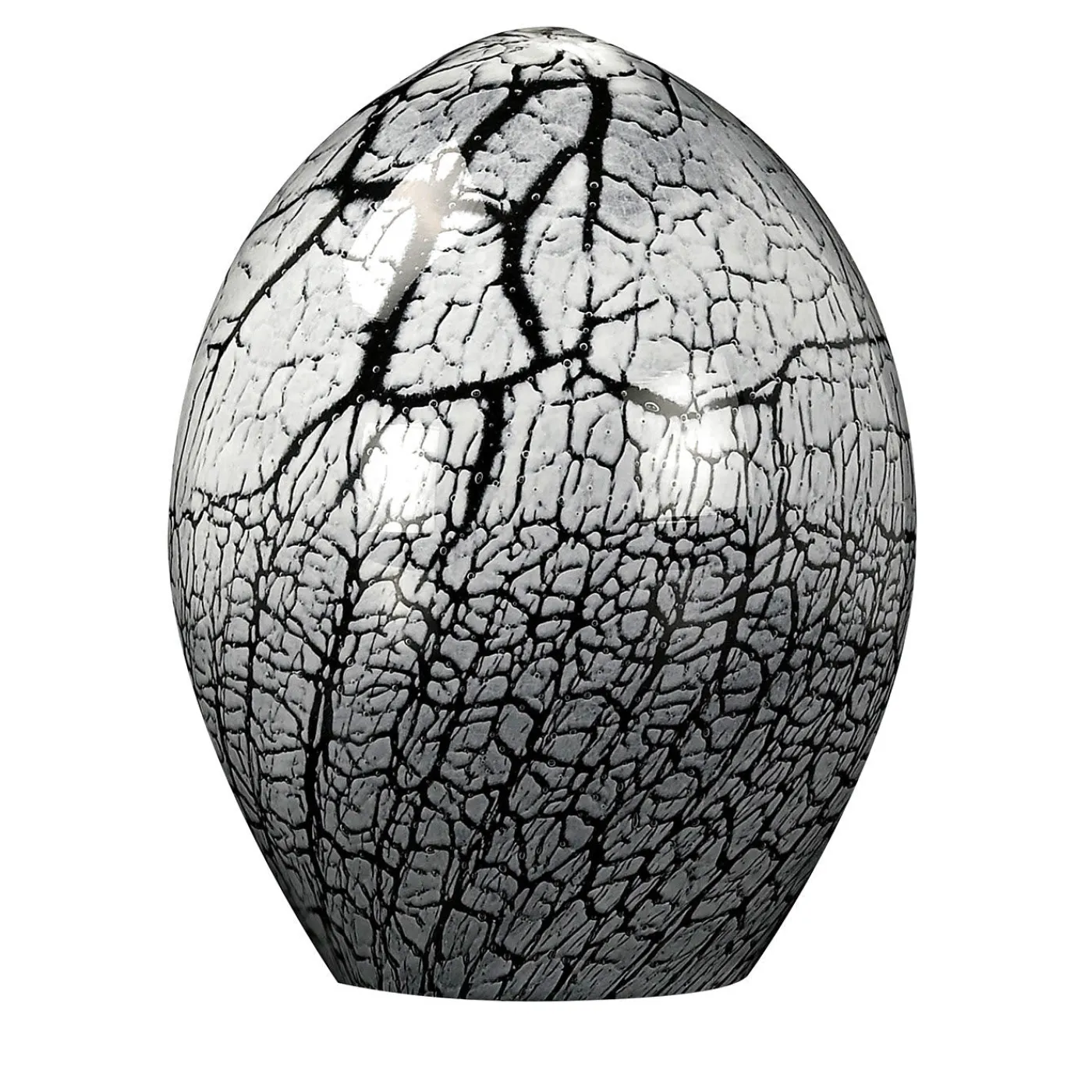 Questa suggestiva statuetta in vetro rappresenta il guscio di un uovo che si rompe, squisitamente reso con venature nere e grigie su una superficie bianca sfumata. Splendido pezzo di una raffinata serie di oggetti d’arredo, infonderà fascino e sottile raffinatezza a una casa moderna.