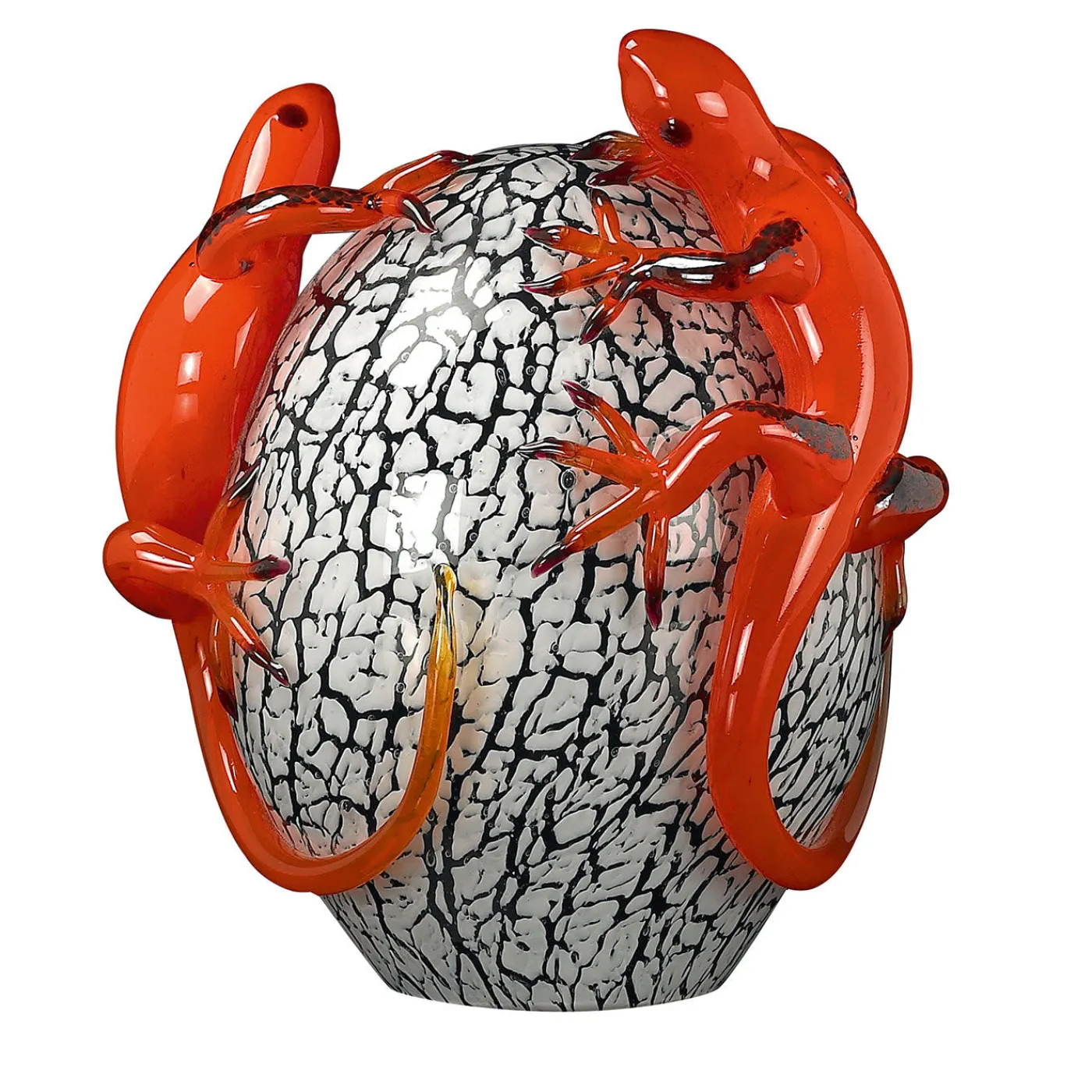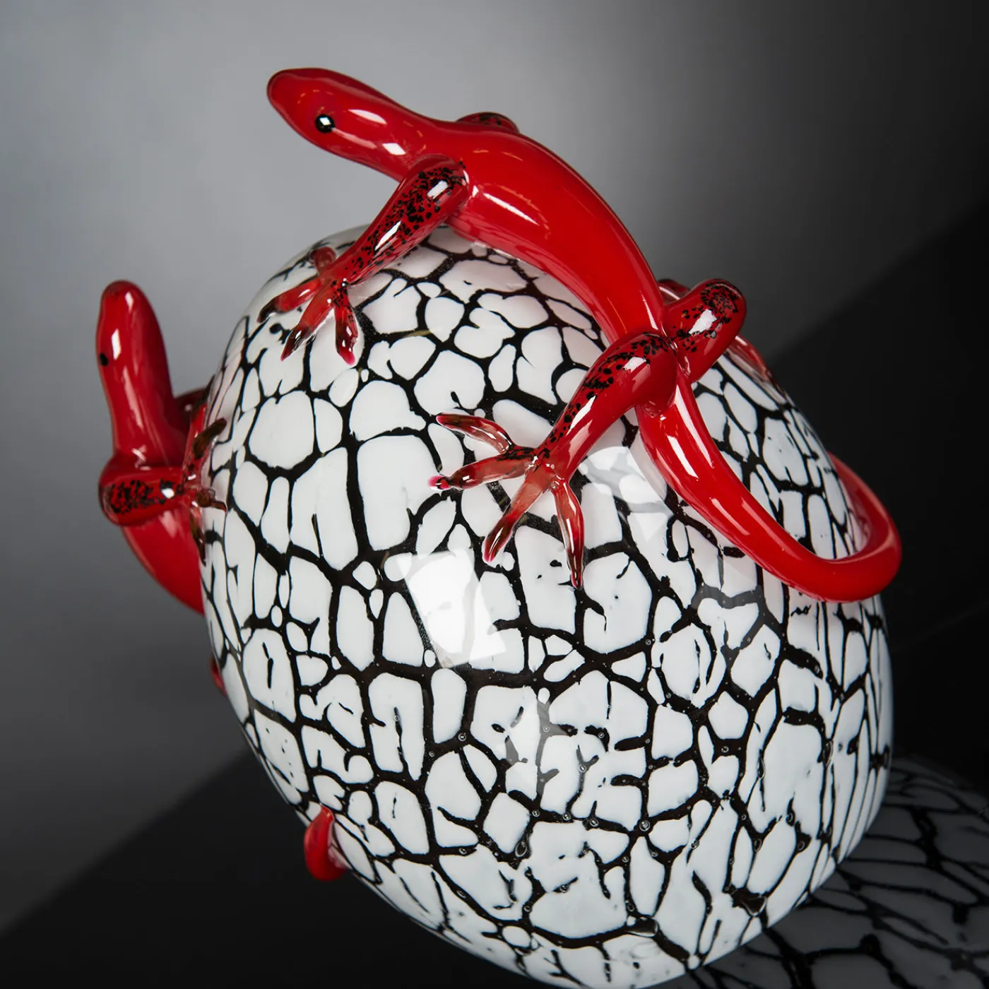 Splendida celebrazione della natura, questa statuetta in vetro conferisce una qualità raffinata a una console, una credenza o un tavolino moderni. Realizzata magistralmente a mano, riproduce la silhouette venata di un uovo che si rompe, arricchito da due vivaci gechi rossi.