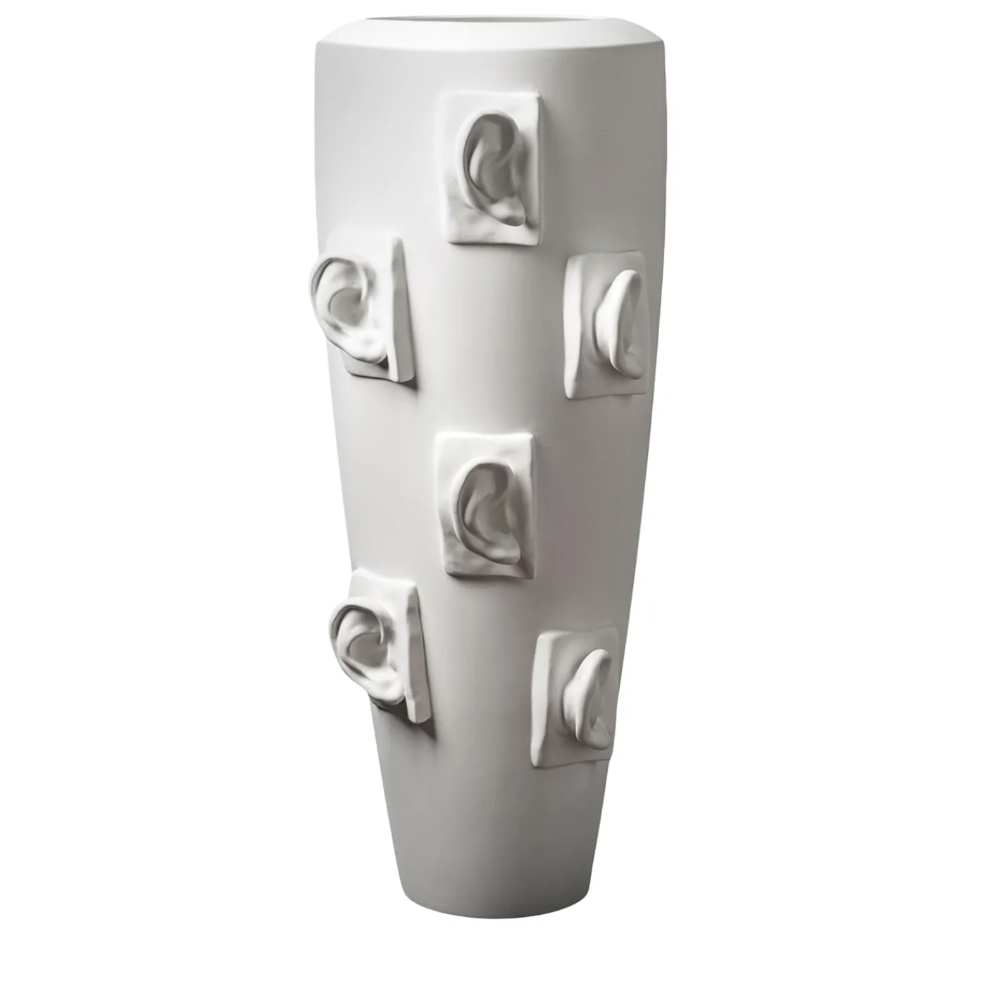 Un gioiello di ceramica che emana puro fascino eclettico, questo vaso decorativo prende in prestito l’iconico orecchio del David di Michelangelo e lo replica per creare un eccentrico motivo in rilievo sul suo esterno. La silhouette pulita di inconfondibile ispirazione moderna è proposta in una finitura bianca opaca che non manca di controbilanciare l’estrosità della decorazione.