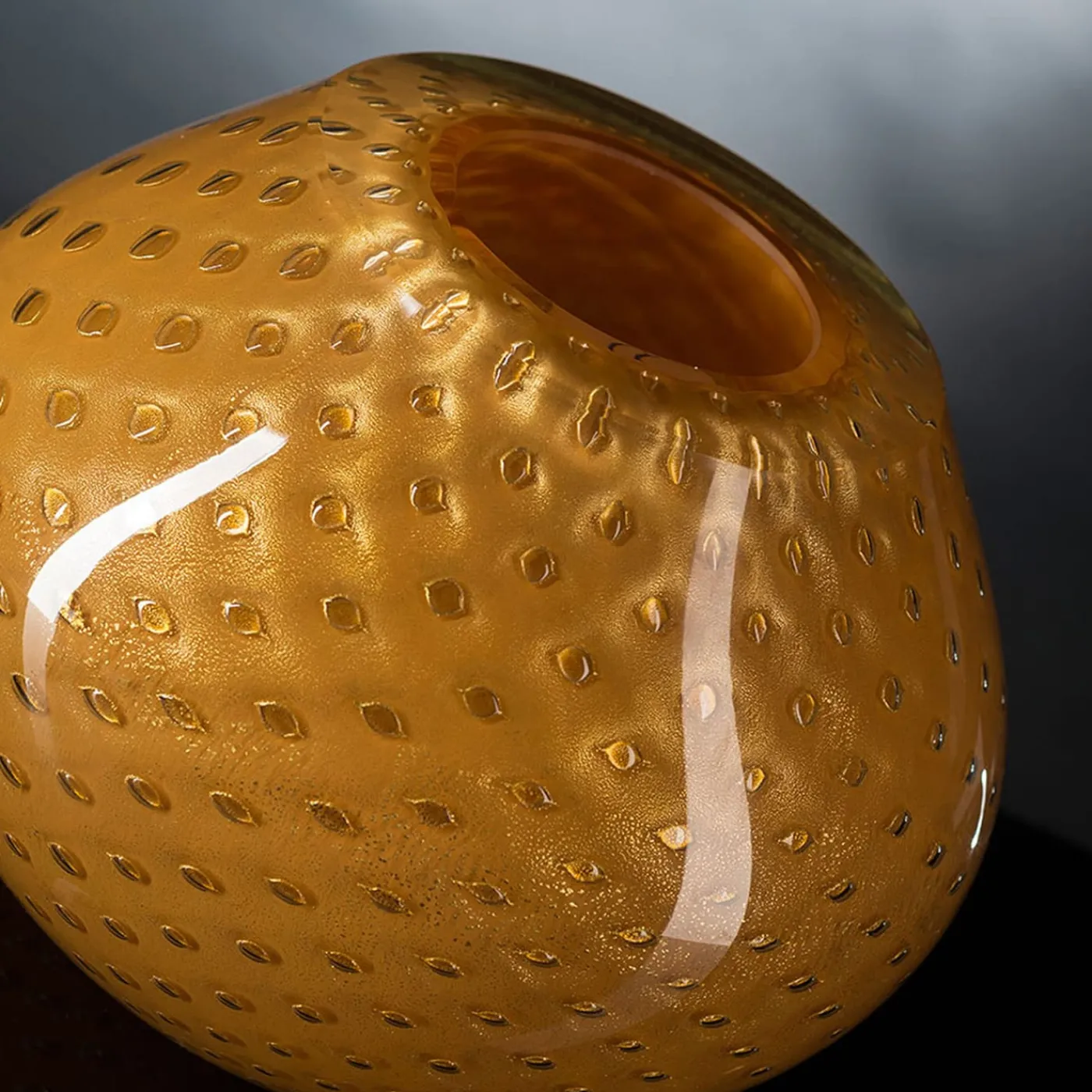 Una forma sferica contraddistingue questo vaso unico in pregiato vetro di Murano. Accuratamente soffiato a bocca, colpisce per il suo aspetto lucido che esalta il motivo dei puntini dorati scintillanti che si stagliano sullo sfondo arancione. Adatto a banchetti sofisticati, questo raffinato design è disponibile in diversi colori che possono essere esplorati nel catalogo Artemest.