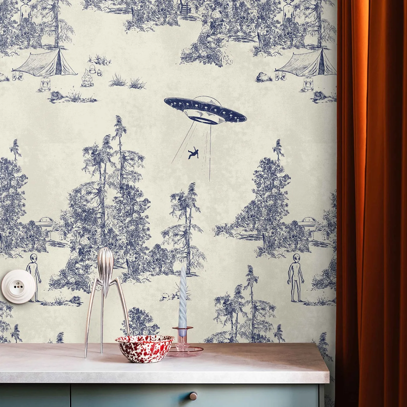 La carta da parati è realizzata in carta ecologica al 100%, stampata con inchiostri vegetali a base d’acqua e priva di sostanze chimiche e solventi. Ogni pacchetto contiene otto fogli. Ispirata alla tradizione inglese del XVIII secolo e stampata in Italia, è perfetta per pareti, mensole e mobili. La carta da parati toile de jouy sull’abduzione aliena offre un tocco creativo al design francese classico. Il prezzo si riferisce a un pacchetto contenente 8 fogli di carta da parati di alta qualità. Ogni foglio misura 27,5 x 39,4 pollici (70 x 100 cm), per una copertura totale di 59,2 piedi quadrati (5 mq).