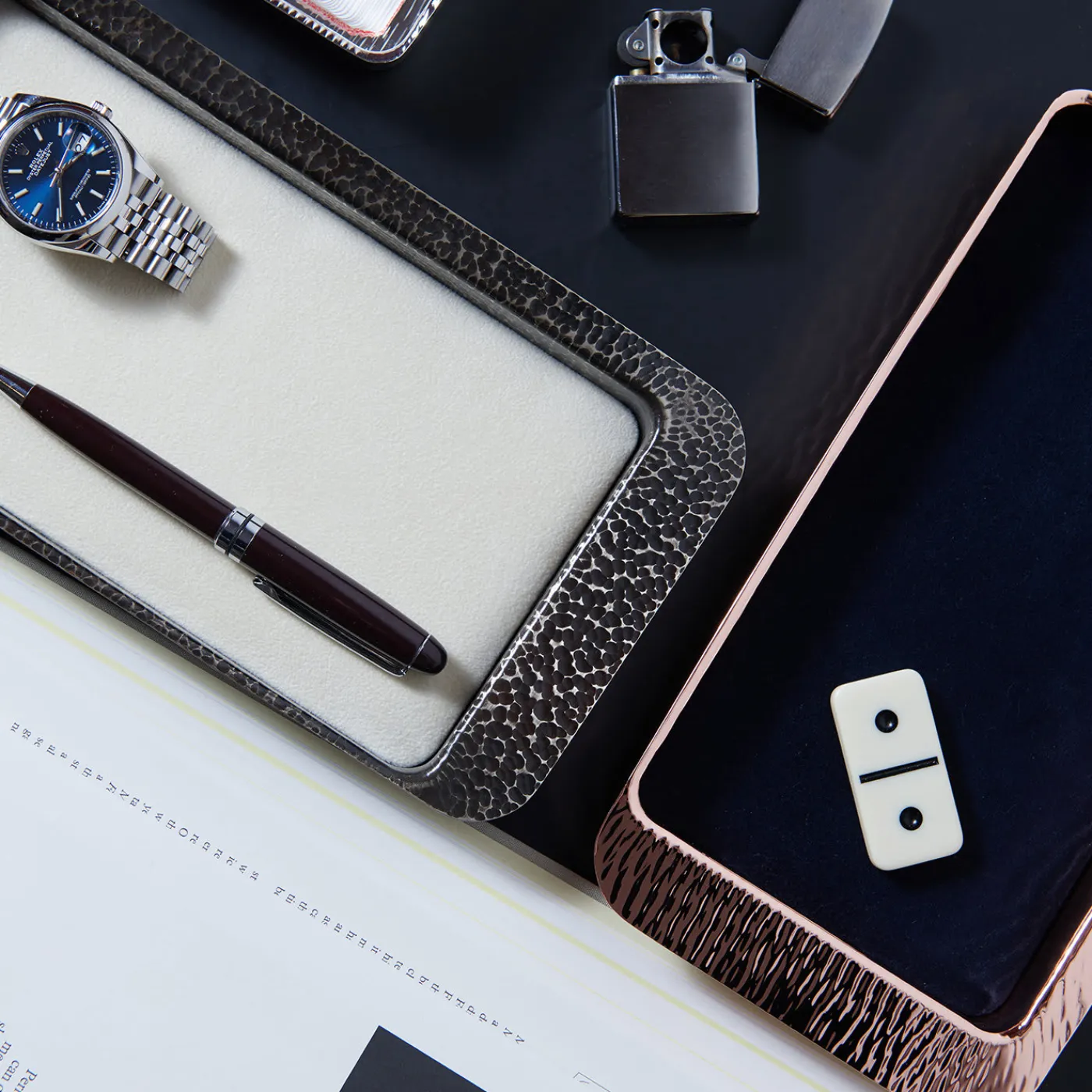 Un vassoio vuoto squisito per abbellire un interno contemporaneo, questo design eccezionale combina un’estetica straordinariamente raffinata con un carattere funzionale. Realizzato a mano in rame martellato con un motivo simile all’acqua, è impreziosito da un cuscinetto interno rimovibile in tessuto blu navy, disponibile su richiesta anche in rosa, bianco crema o azzurro. La sua forma rettangolare, lucida e dettagliata, è proposta anche nella versione in bronzo brunito, lega d’argento e ottone dorato.
